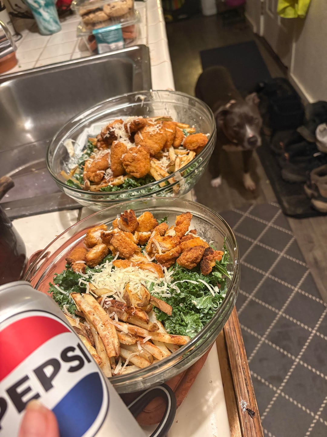 Dinner: Caesar salad with Kirkland chicken nuggets and mini pizzas with turkey pepperoni & fat free mozzarella
