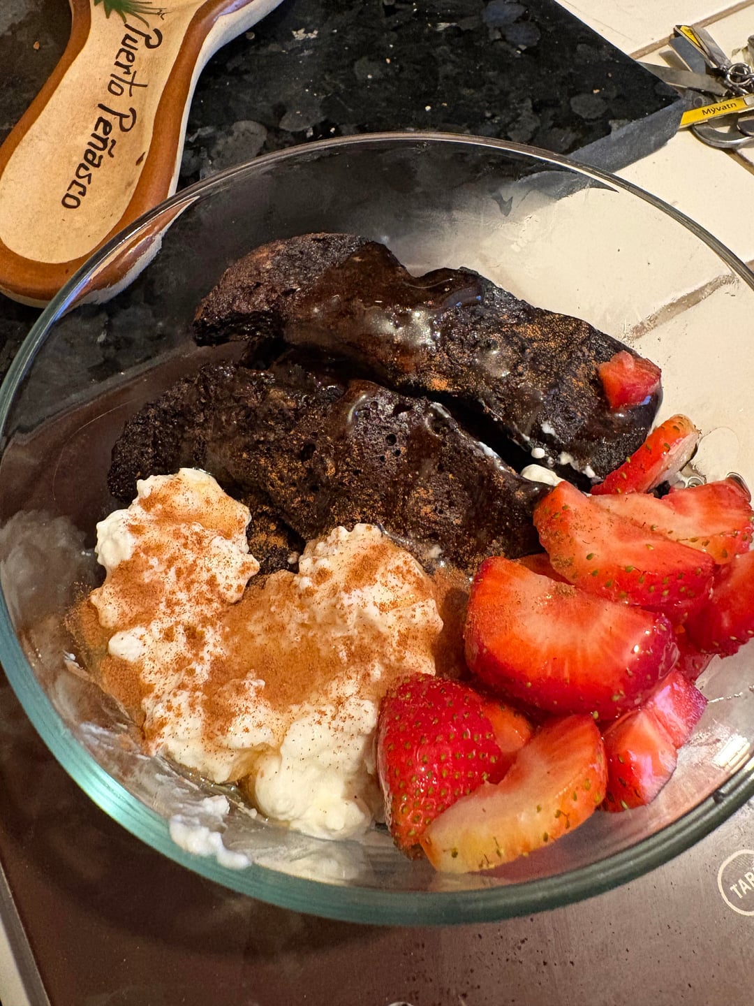 Lunch: Choco-French toast (texture after re-heat is meh- recipe needs tweaking) bowl with cottage cheese & berries + Alani pink slush