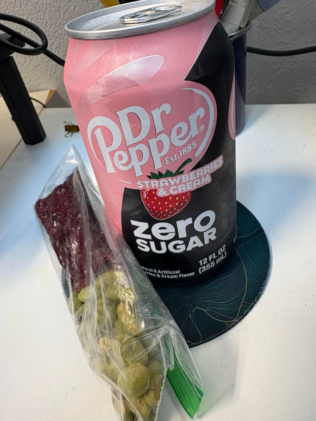 Snack: old trapper beef stick, salted edamame, Zero Sugar strawberries & cream Dr. Pepper