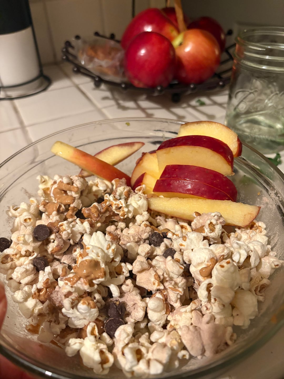 Sweet Treat: popcorn with PBfit, peanut butter cup protein powder, lily’s chocolate chips & apple slices