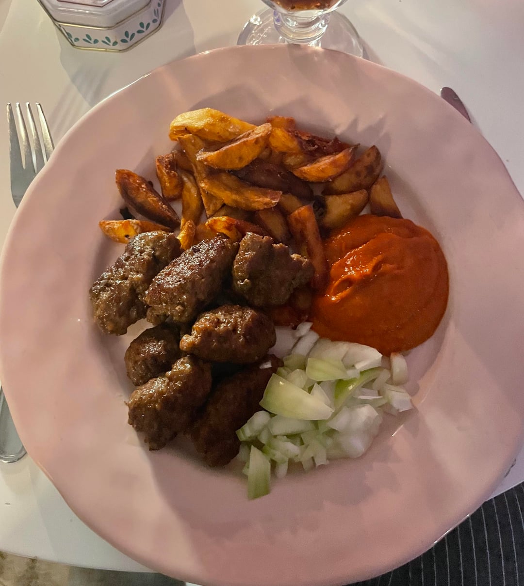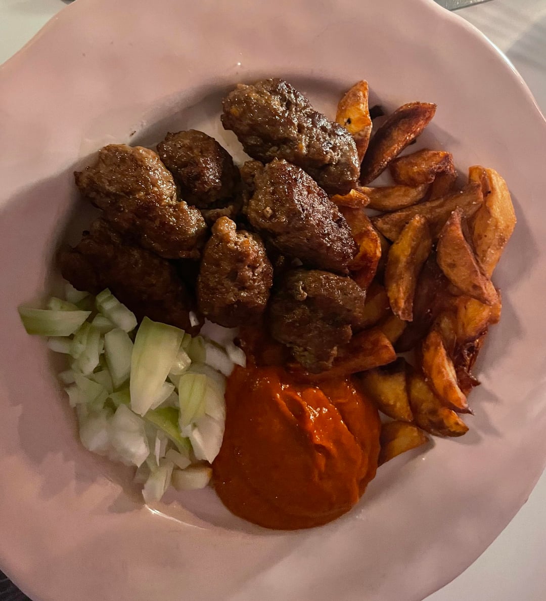 Tonight’s dinner: Cevapcici with homemade ajvar, fries and finely chopped onion. Yum! 😋