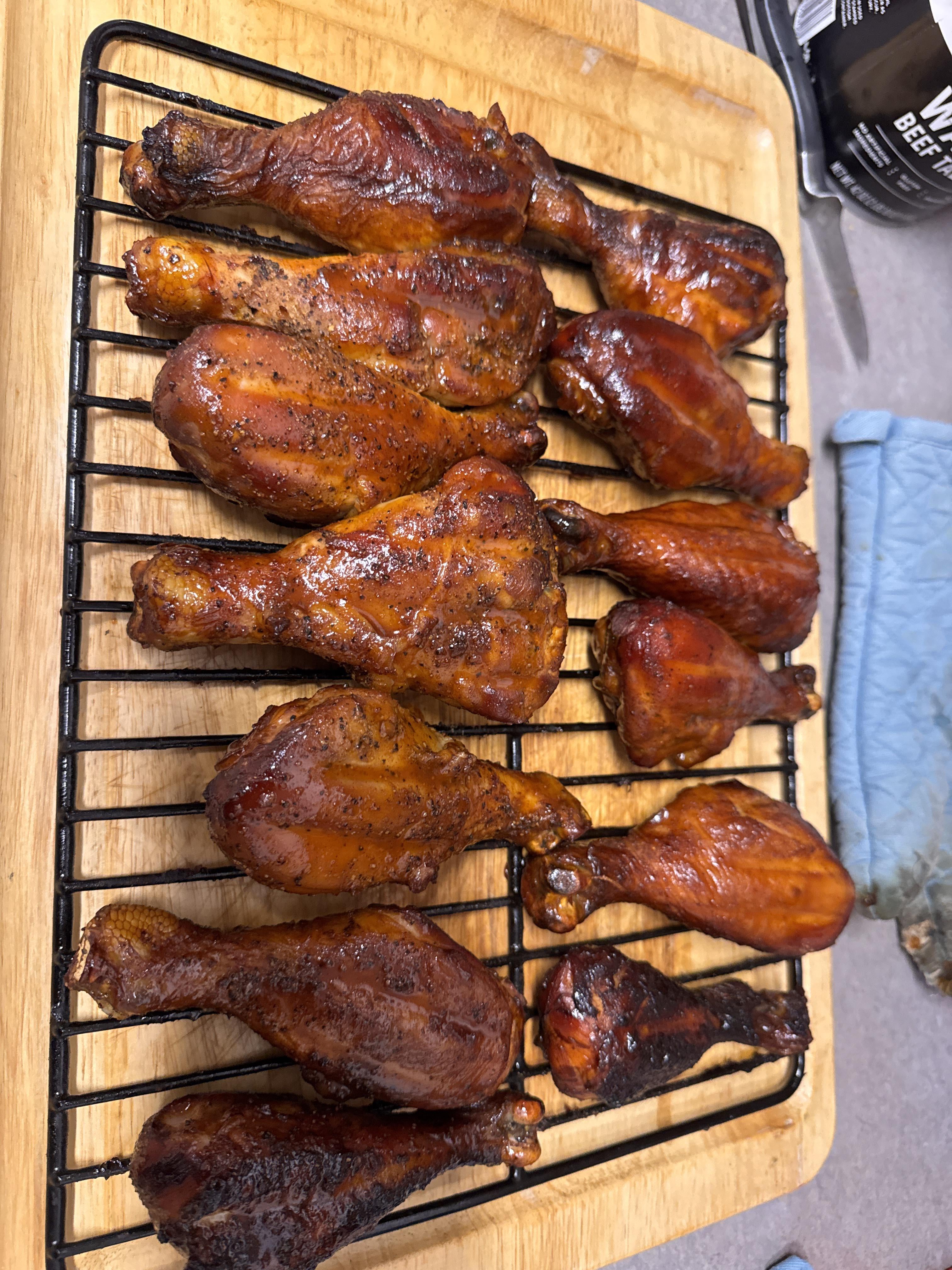 Smoked applewood drumsticks. Glaze with hickory barbecue sauce. This has been my best attempt. by Electrical-Time-love Food