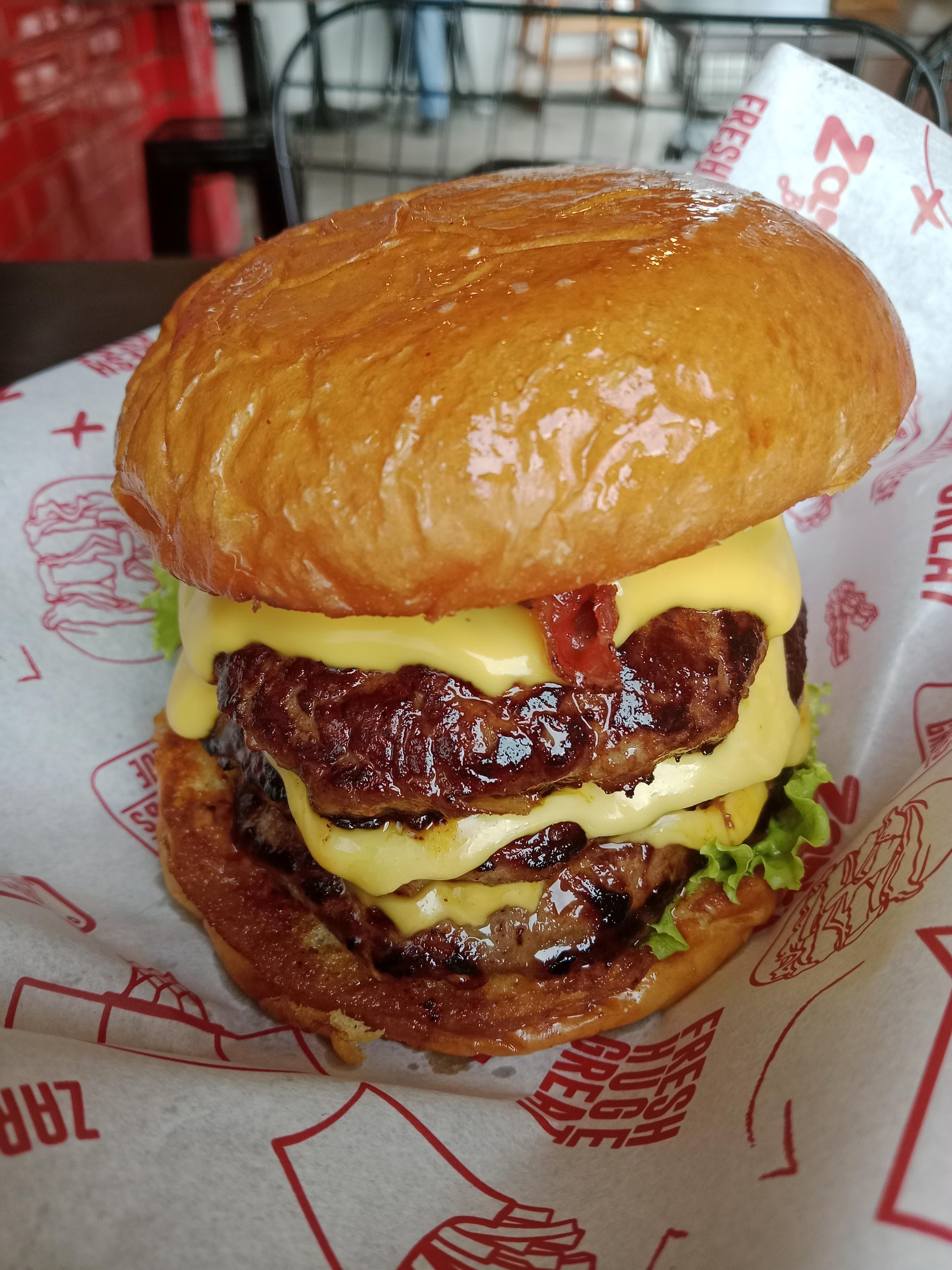 3 beef patty, melted cheese ,bacon, mustard ,hot sauce, tomato , lettuce ,caramelized onion by Emrash1093 Food