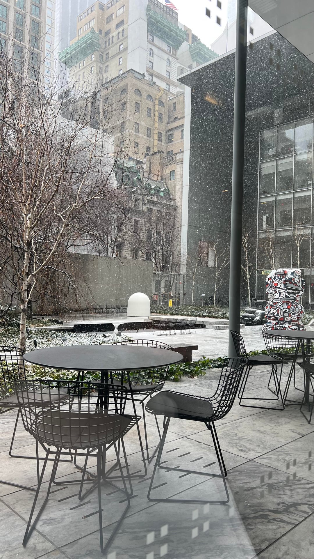 The Modern: Went for lunch and did the full tasting menu. It was probably my fifth visit, and it remains one of my favorite NYC restaurants, despite being disappointed last time at the 20-year anniversary dinner with DOM. “Eggs on Eggs on Eggs” (pic 7) is still one of my favorite dishes in the city (along with César’s monaka and Jungsik's kimbap). This time, every course was great, especially the scallop, the chicken, and the Australian wagyu (pic 8). Desserts are usually where I feel The Modern underdelivers, but the chocolate-and-cherry dessert was genuinely strong. I was seated by the window facing the garden, and watching the snow fall was lovely (pic 9).