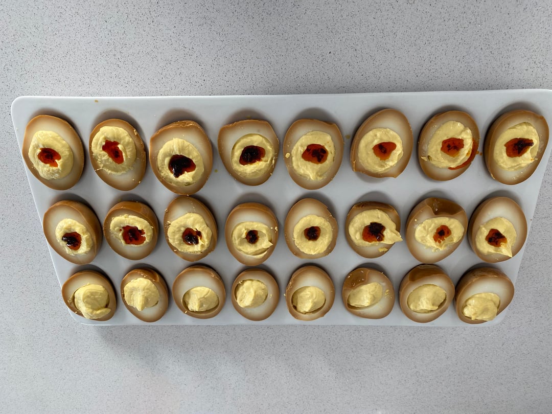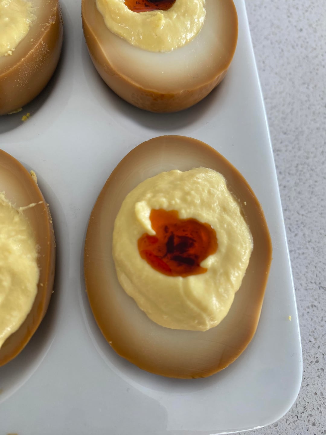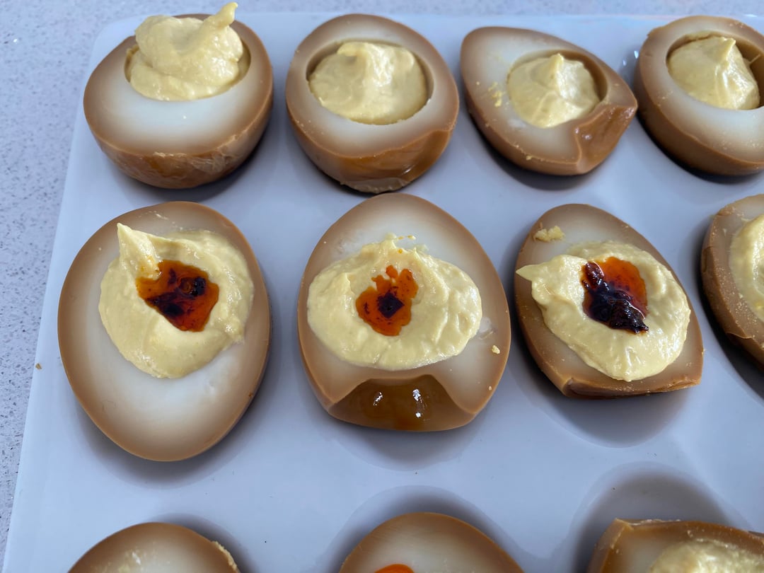 Soaked hard, boiled eggs in ginger, garlic, soy sauce, and water for two days. For the filling, I used the egg yolks, kewpie Mayo, ginger, a dash of sugar, dash of salt, and some mustard. Crunchy chili oil to top. by Novakain911 Food