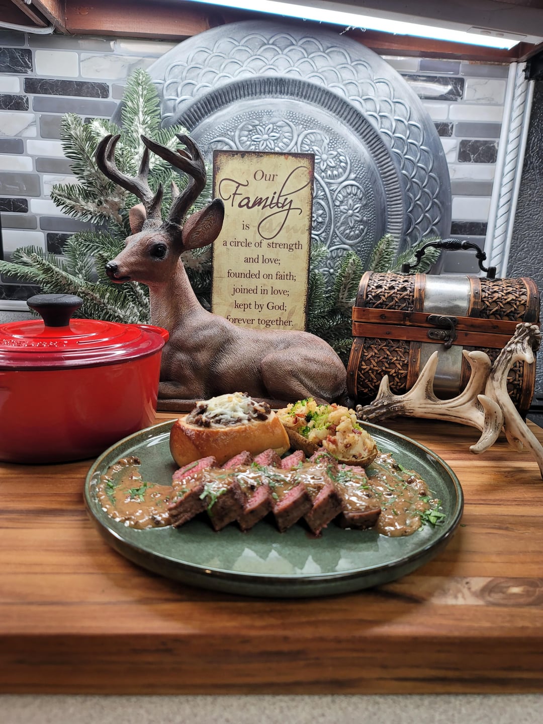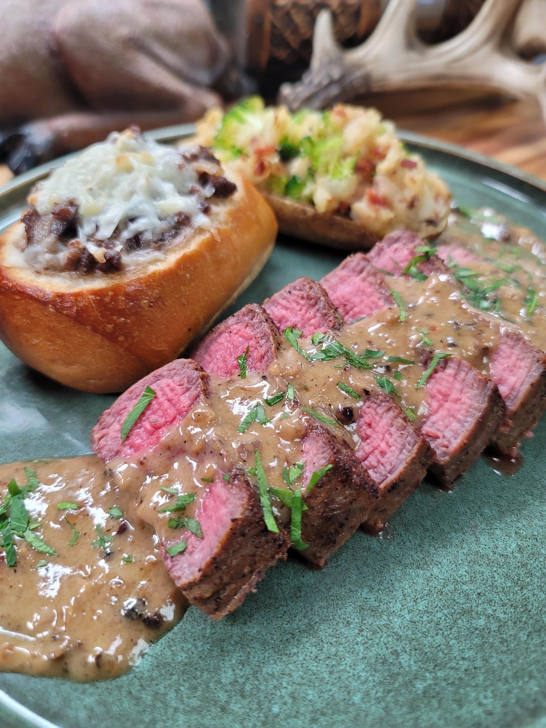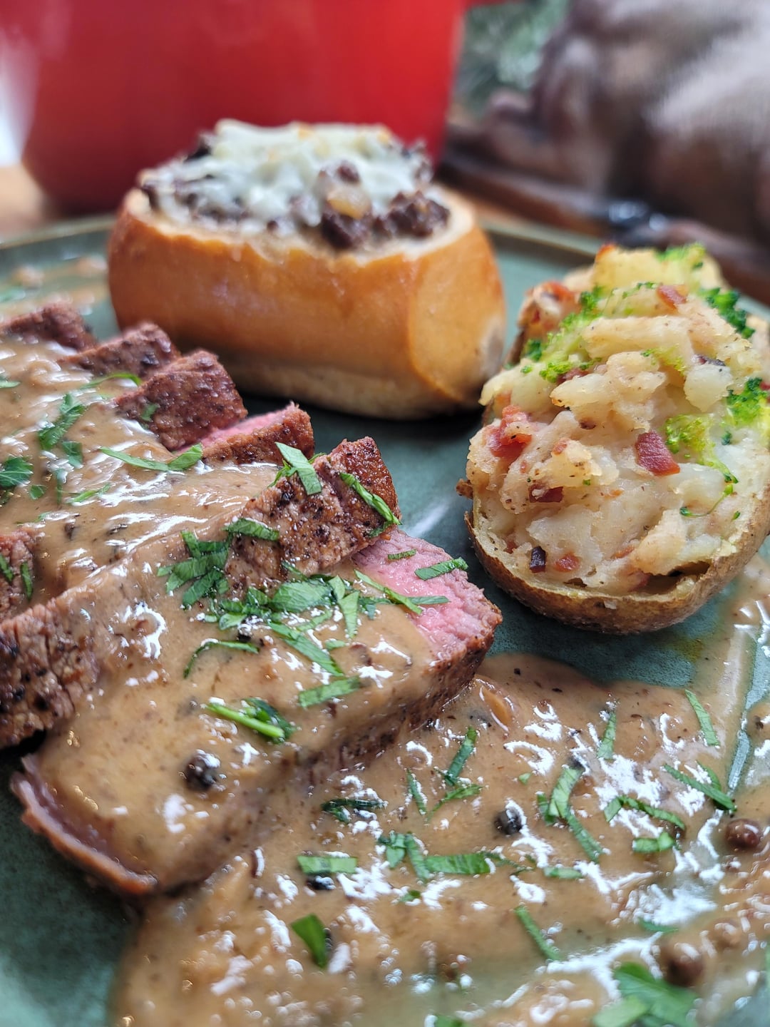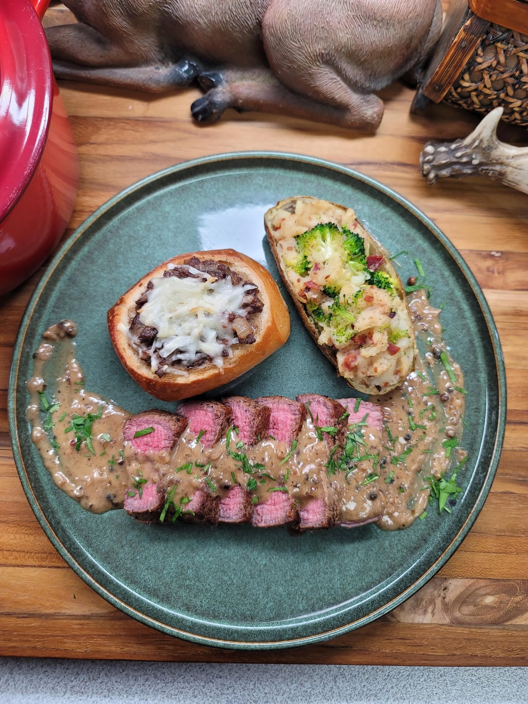 [Homemade]Steak with peppercorn cream sauce, Twice Baked Potato with bacon, broccoli, and cheese, & Creamy-Beefy-Shroomy (Stroganoff) Soup in a sour dough bread bowl.