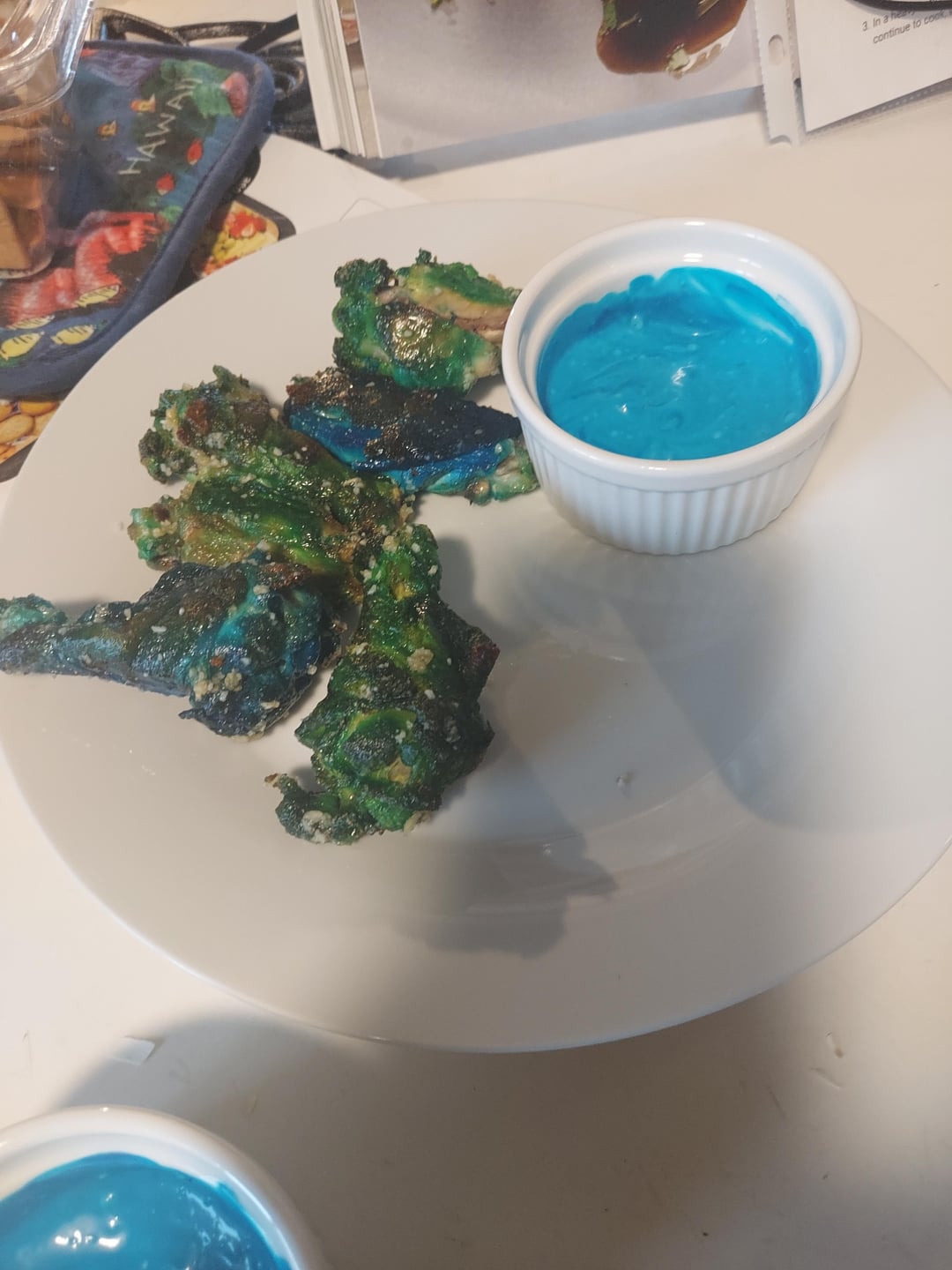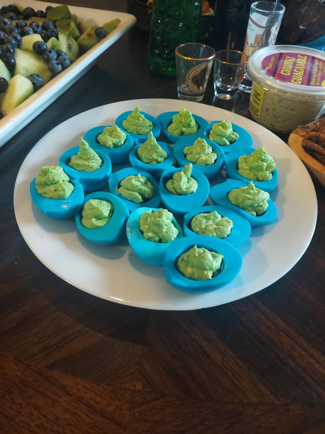 Featuring Seahawk wings (garlic parm and a blue cheese sauce with extra blue) and Seahawk deviled eggs. Went into this knowing it’d look cursed, but had to do it for the bit.