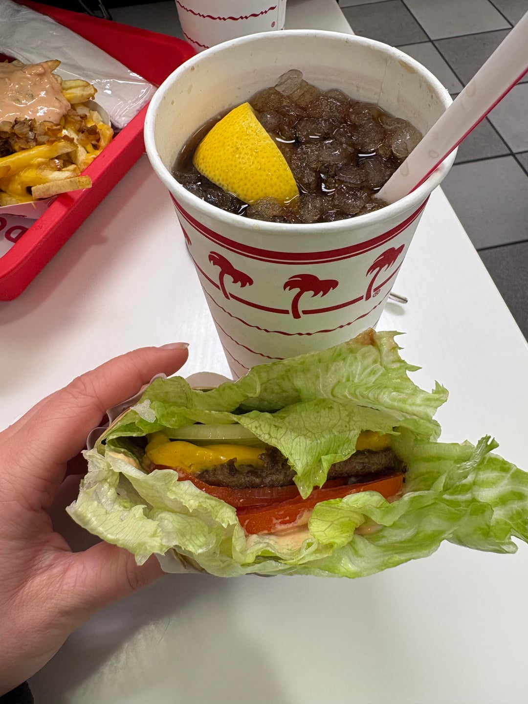 Dinner: in n out- cheeseburger w/ onion protein style- Diet Coke and lemon