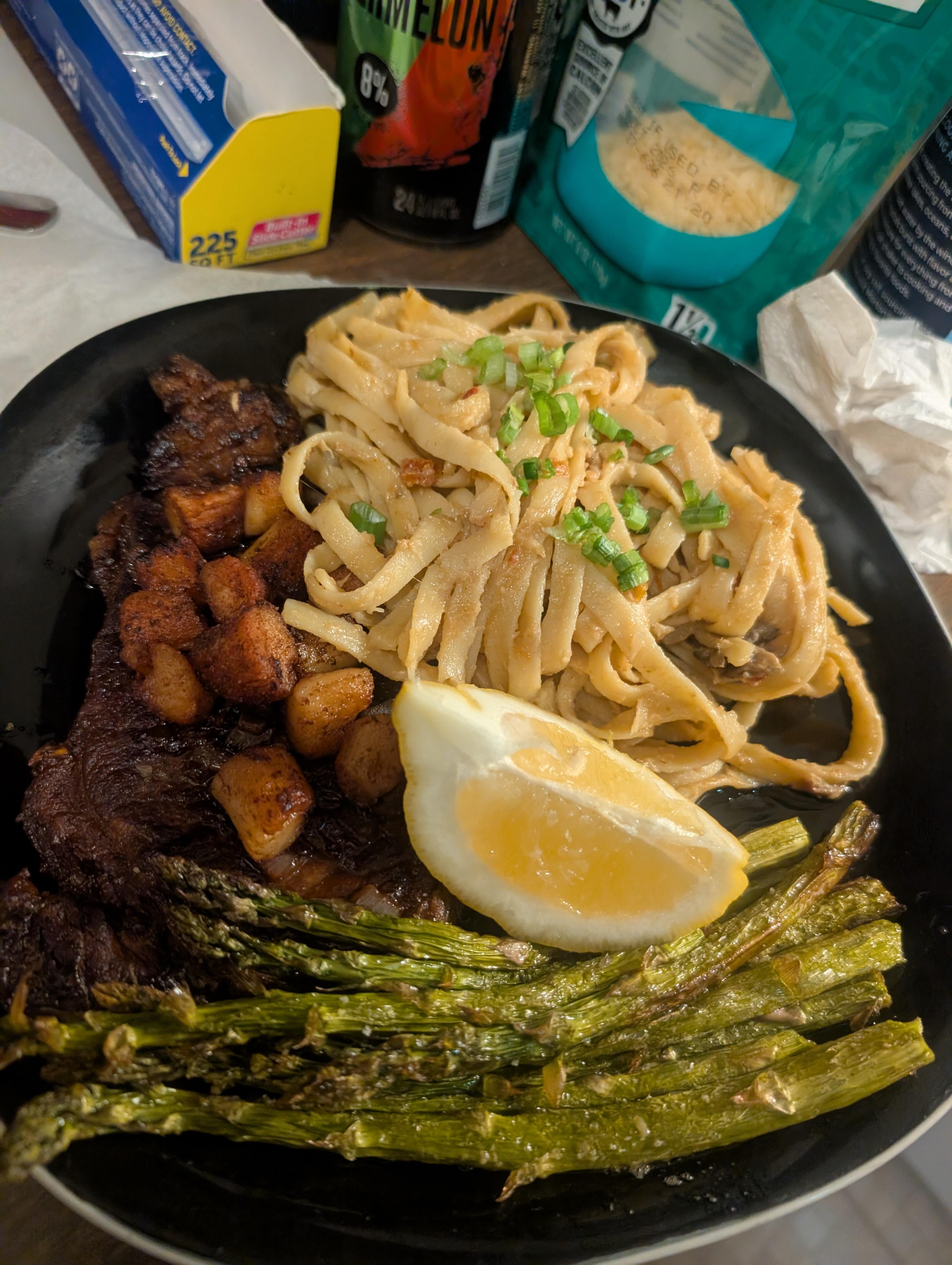New York strip, scallops, and mushroom fettuccine with cream sauce, per my girlfriends request by cohonka Dinner Tonight Tonight's Dinner