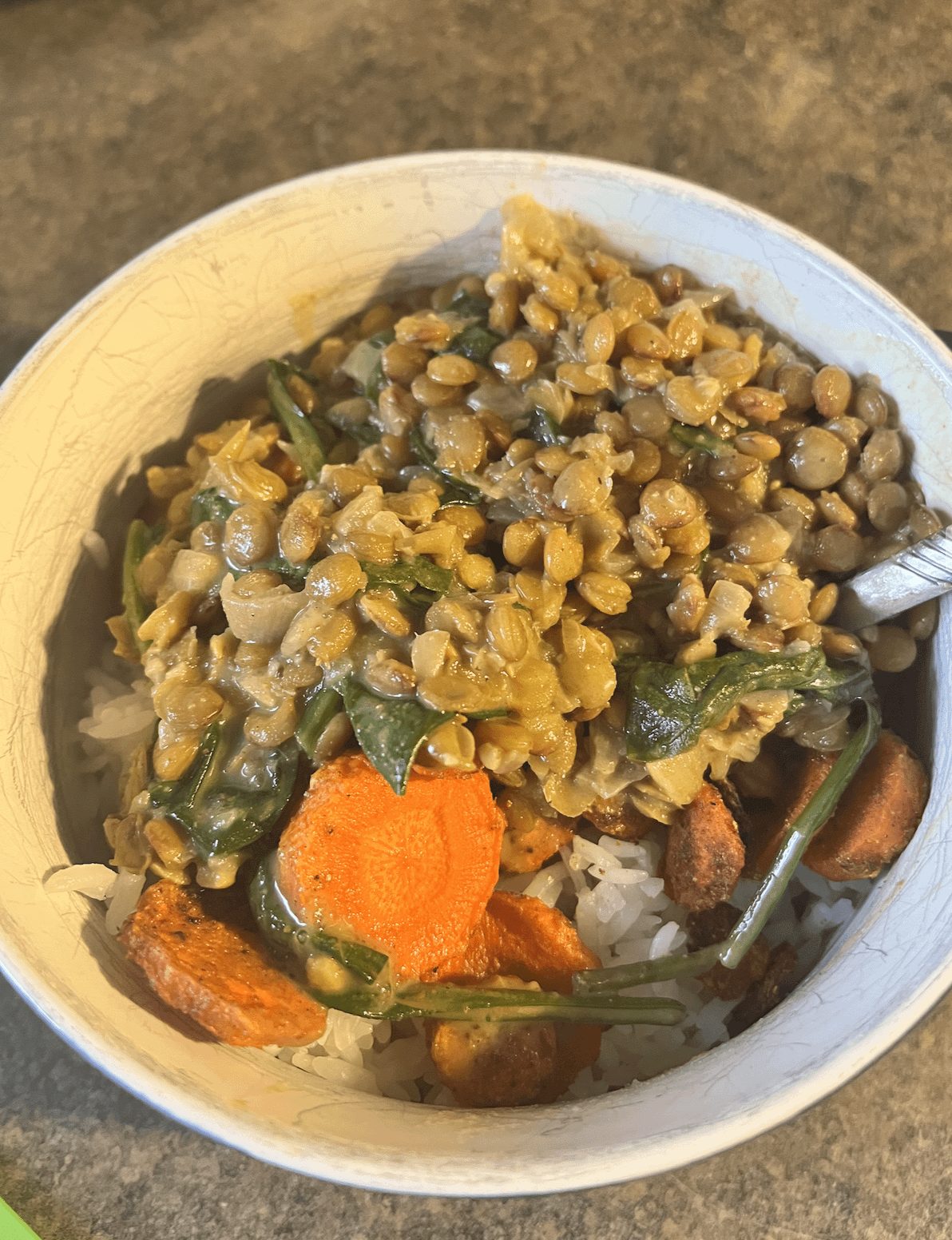 [https://www.budgetbytes.com/creamy-coconut-curry-lentils-with-spinach/](https://www.budgetbytes.com/creamy-coconut-curry-lentils-with-spinach/)
