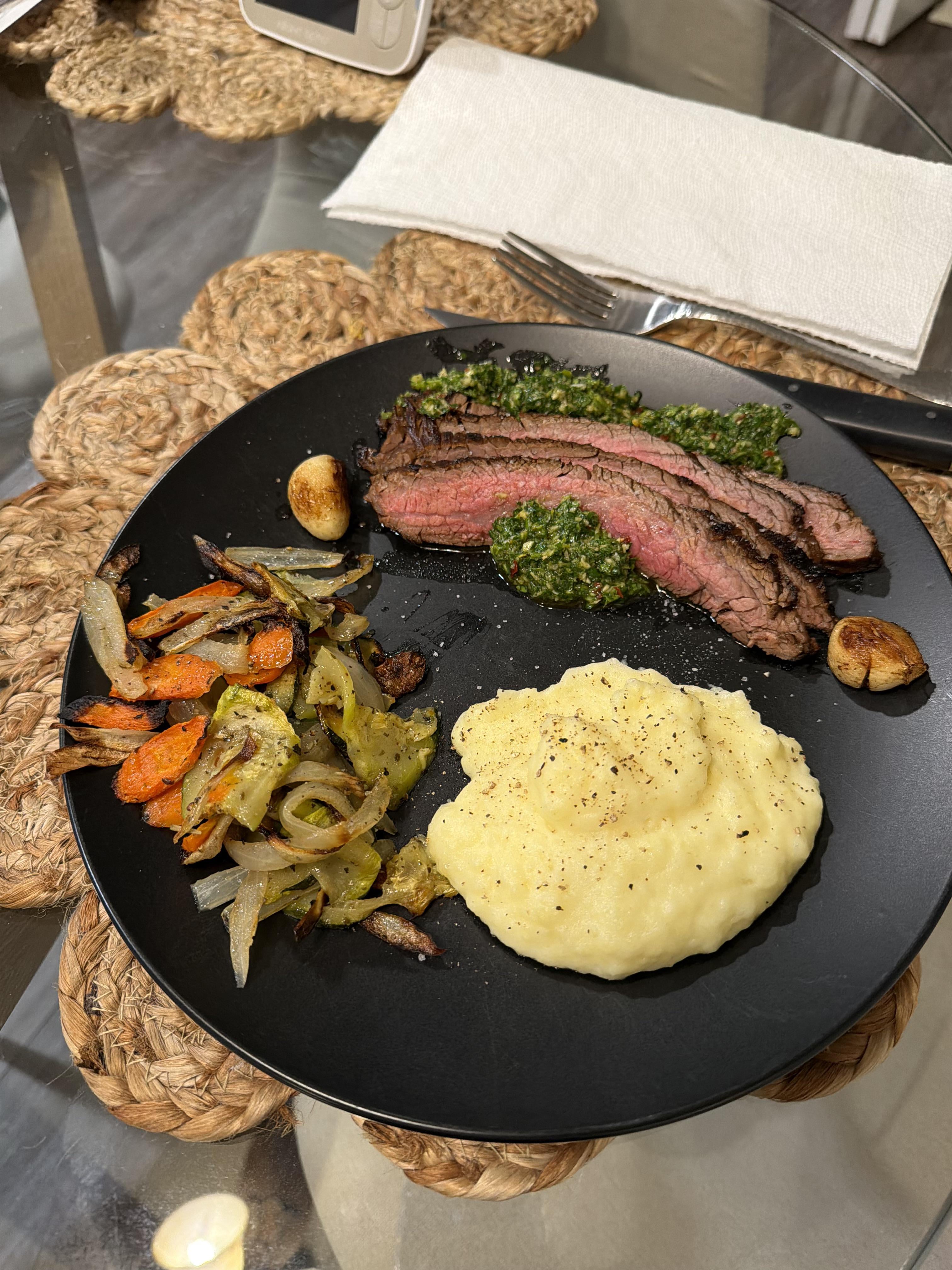 Husband’s “throw together” meal- Steak, chimichurri, mashed potatoes, and roasted veggies by secretjanee Dinner Tonight Tonight's Dinner