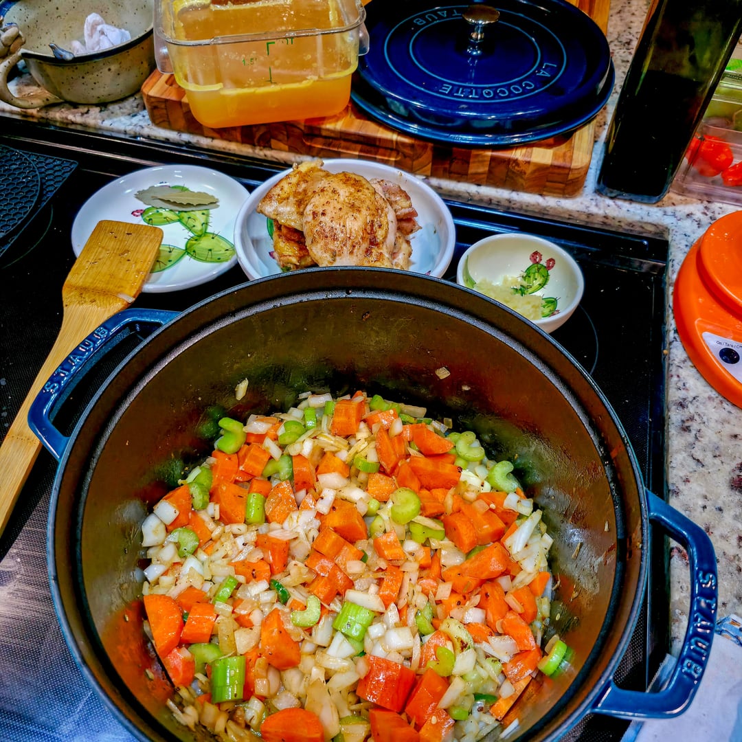 – Add bay leaves and chicken thighs to soup, making sure to pour in any chicken juice from seared thighs.