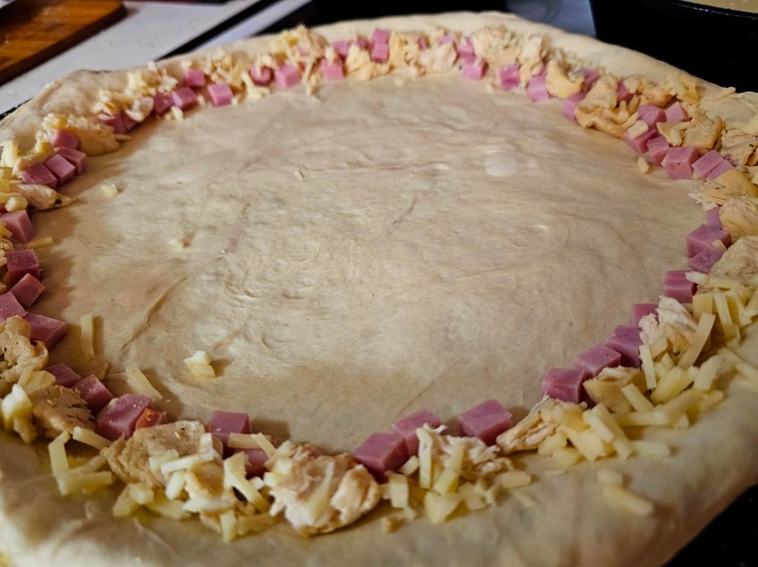 I hate making dough so I used store bought 🤣 line the edge with chicken, ham, & swiss cheese then roll and tuck it under.