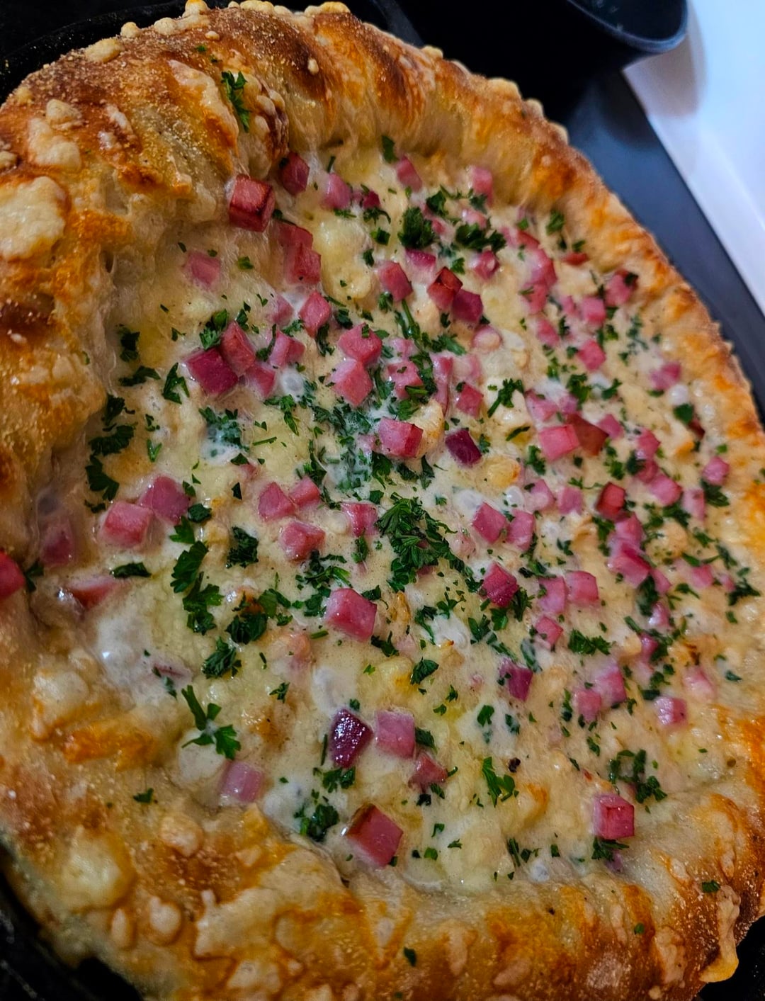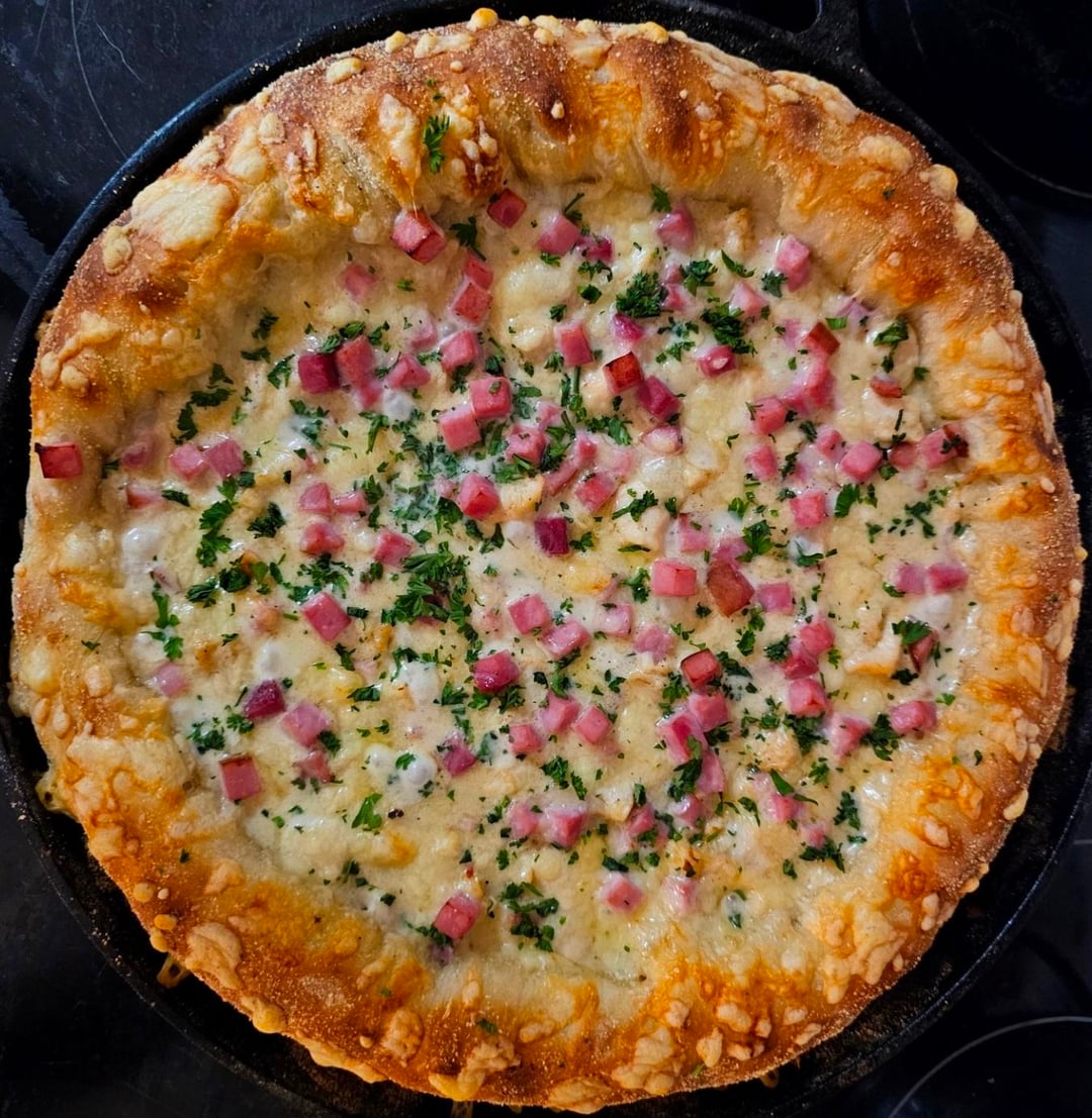 Bake @ 550° on cast iron using the bottom oven rack, sprinkle of parsley, & enjoy! 😁