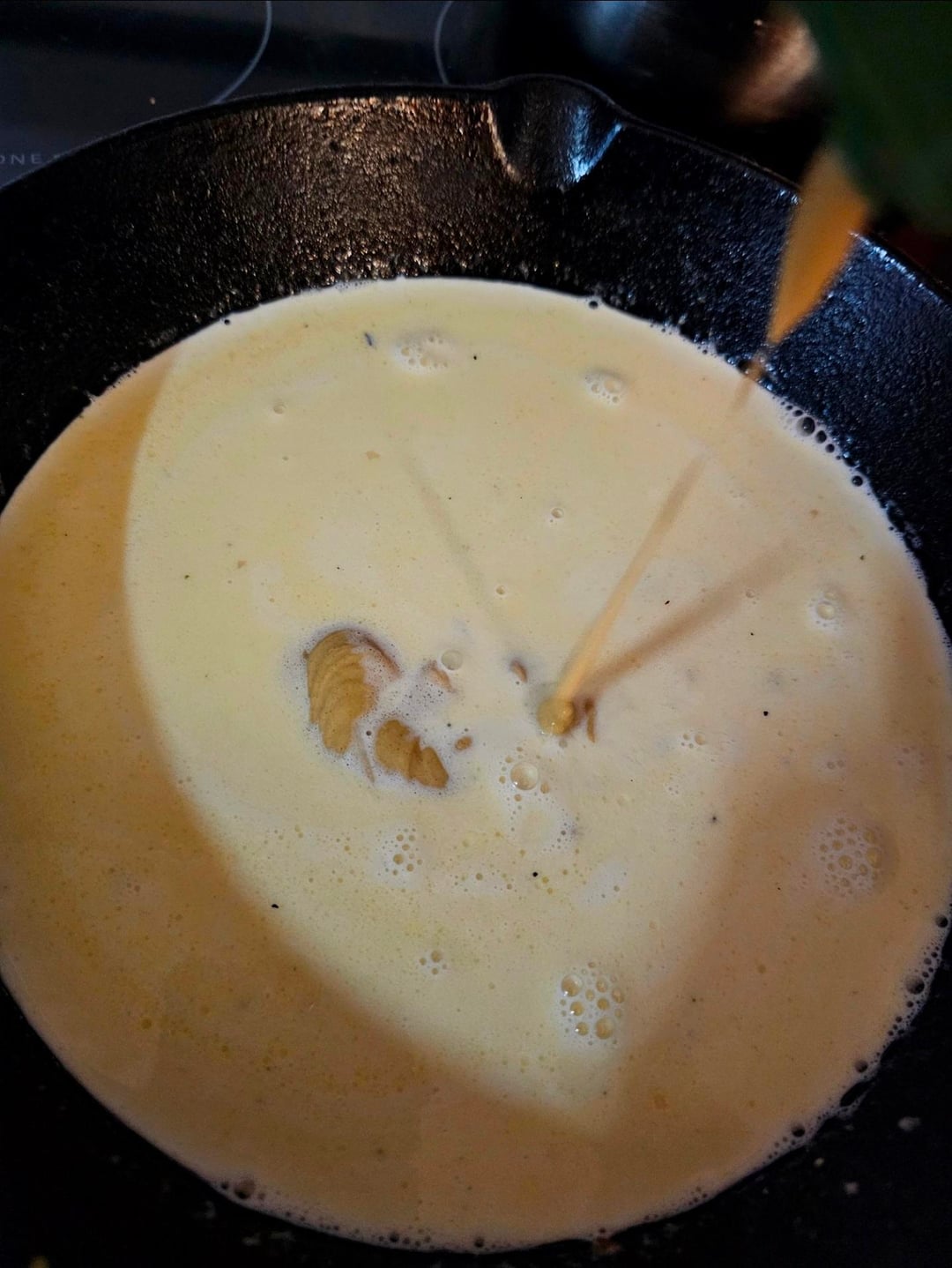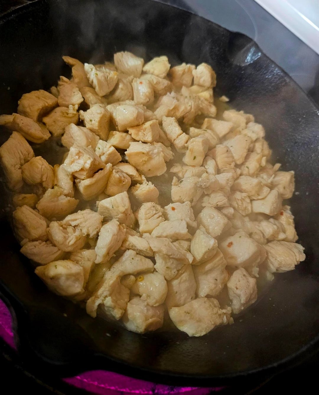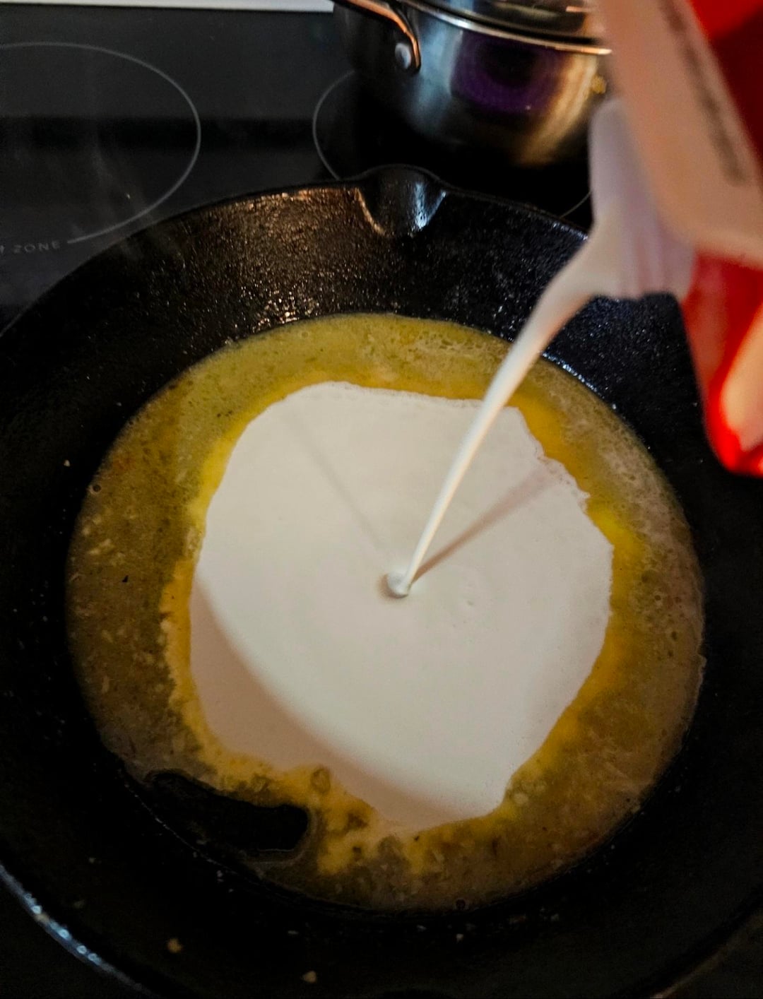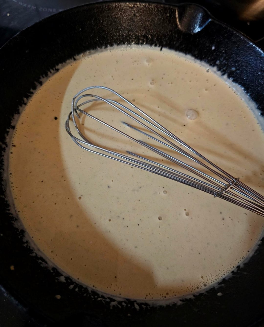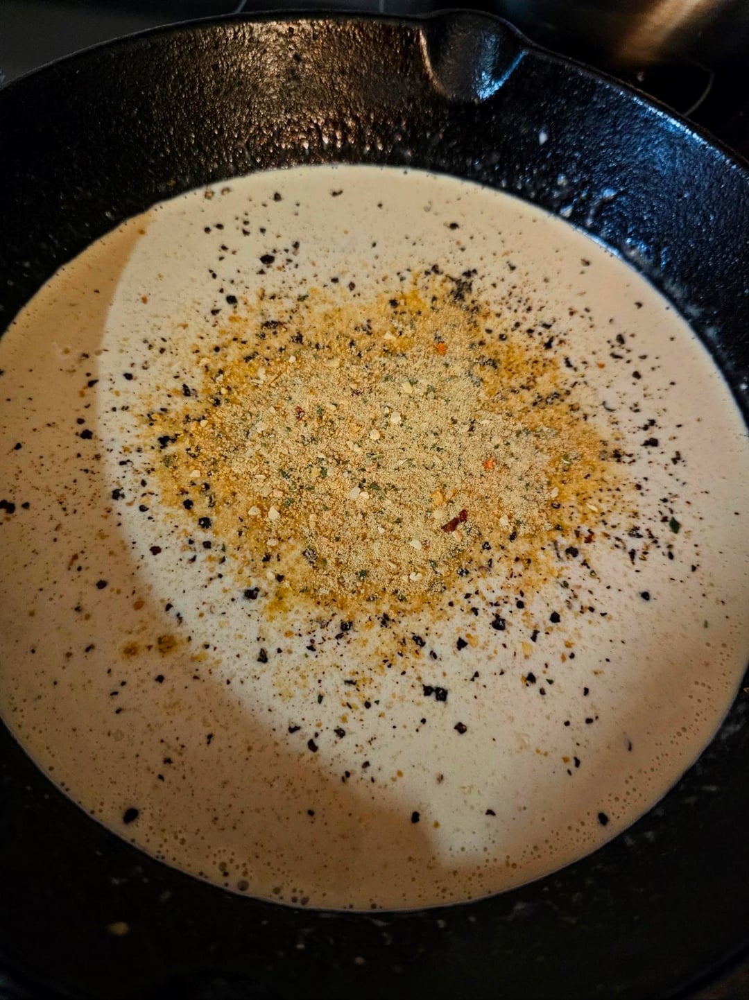 The chicken was cooked in butter with some Oscar’s honey garlic rub then set aside to make the sauce…more butter, cream, dijon, more honey garlic rub, and pepper. Whisk, simmer, reduce, adjust to taste.