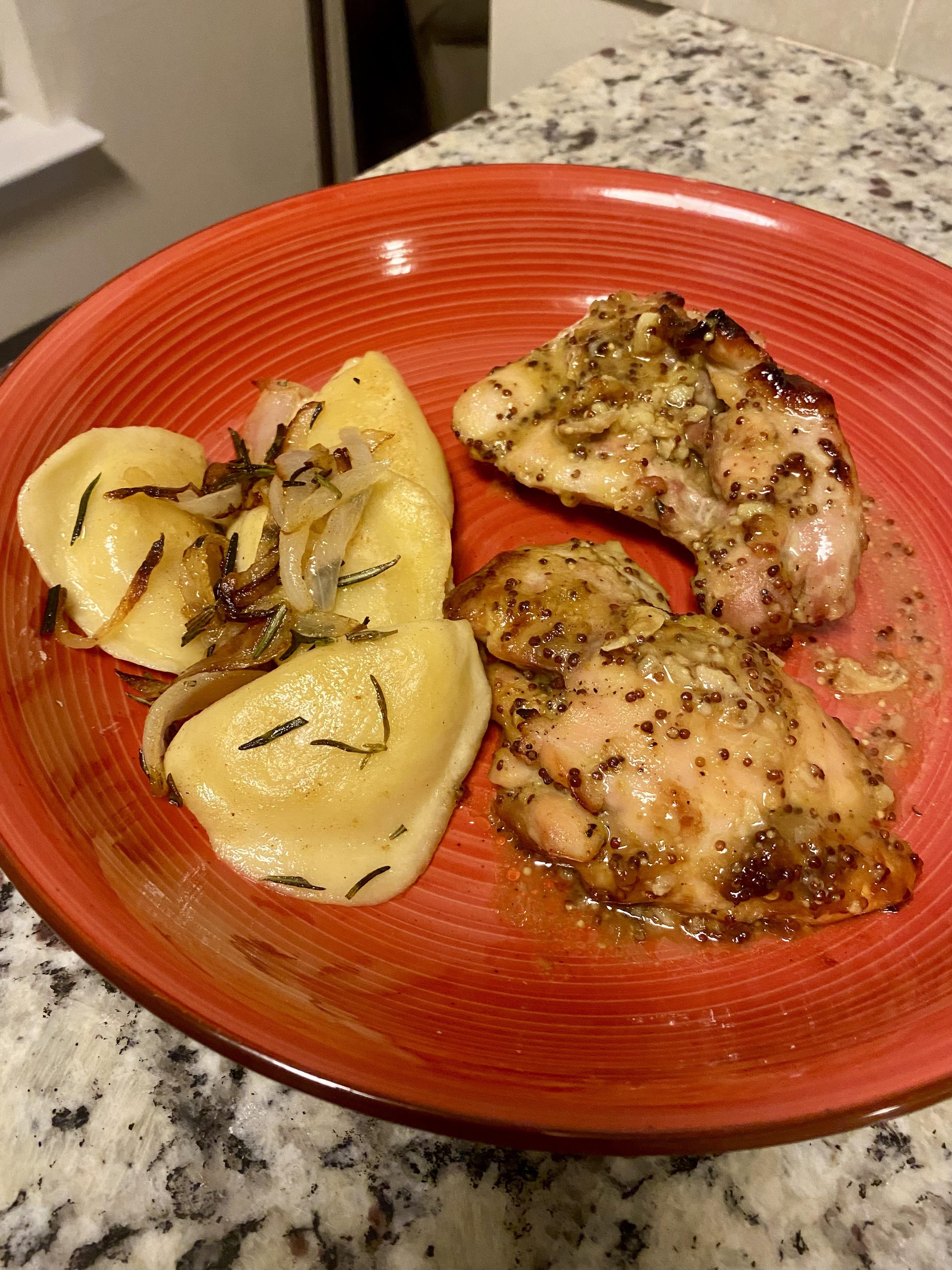Baked chicken thighs in mustard sauce and pirogies sautéed with onions and rosemary by batmanandrobin26 Dinner Tonight Tonight's Dinner