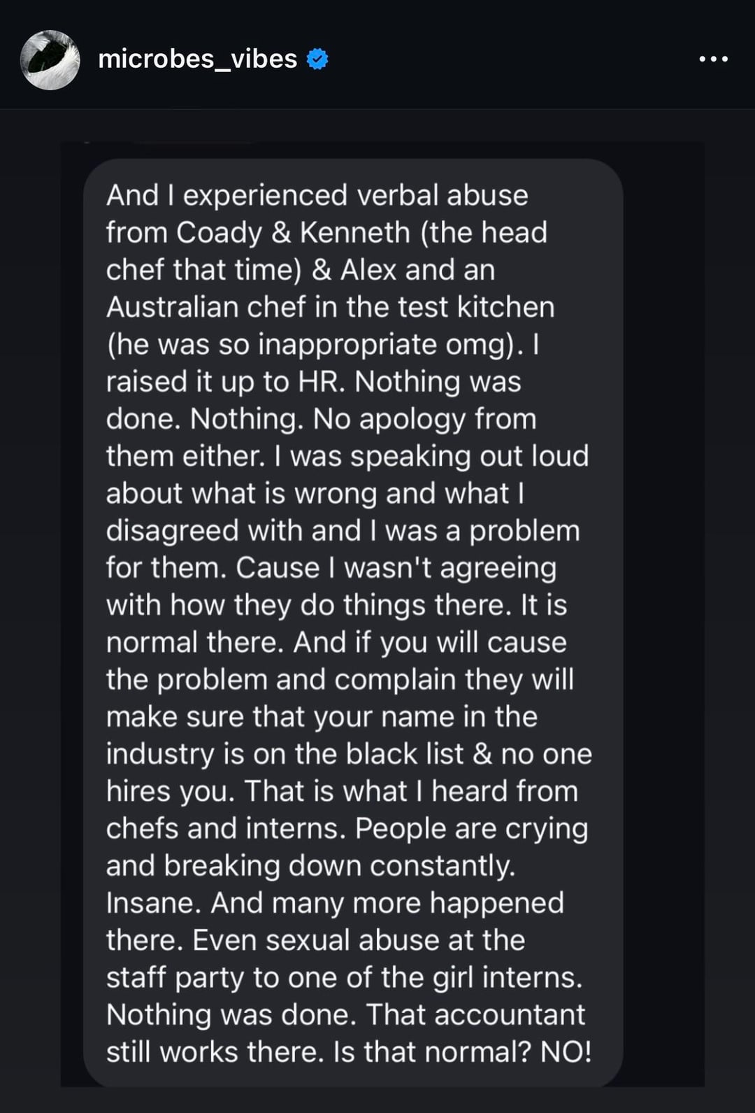 Screenshots from Jason White’s (@microbes_vibes on IG) page recounting his but mostly others’ experience of the abuse at the hands of Rene. It seems like he’s slowly been building up to this point for a couple years. I wonder what the average diner thinks about it.