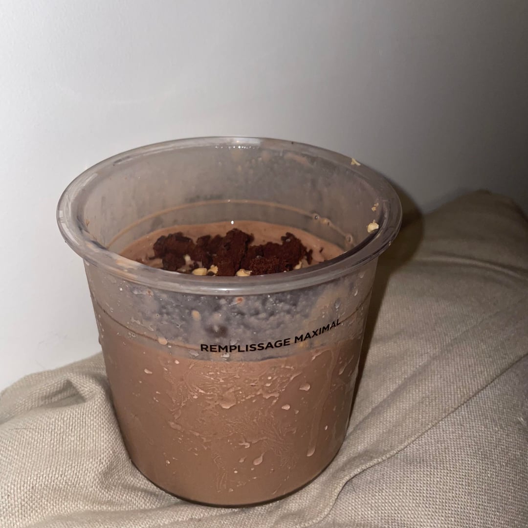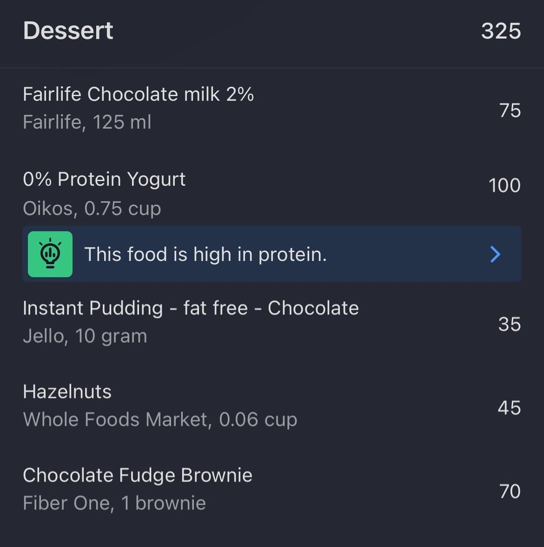 For my base I do a serving of Oikos pro Greek yogurt (vanilla) with 10 grams fat free chocolate jello pudding powder, half a cup of fairlife chocolate milk and a pinch of salt (can also add a pack of sweetener if you’d like).