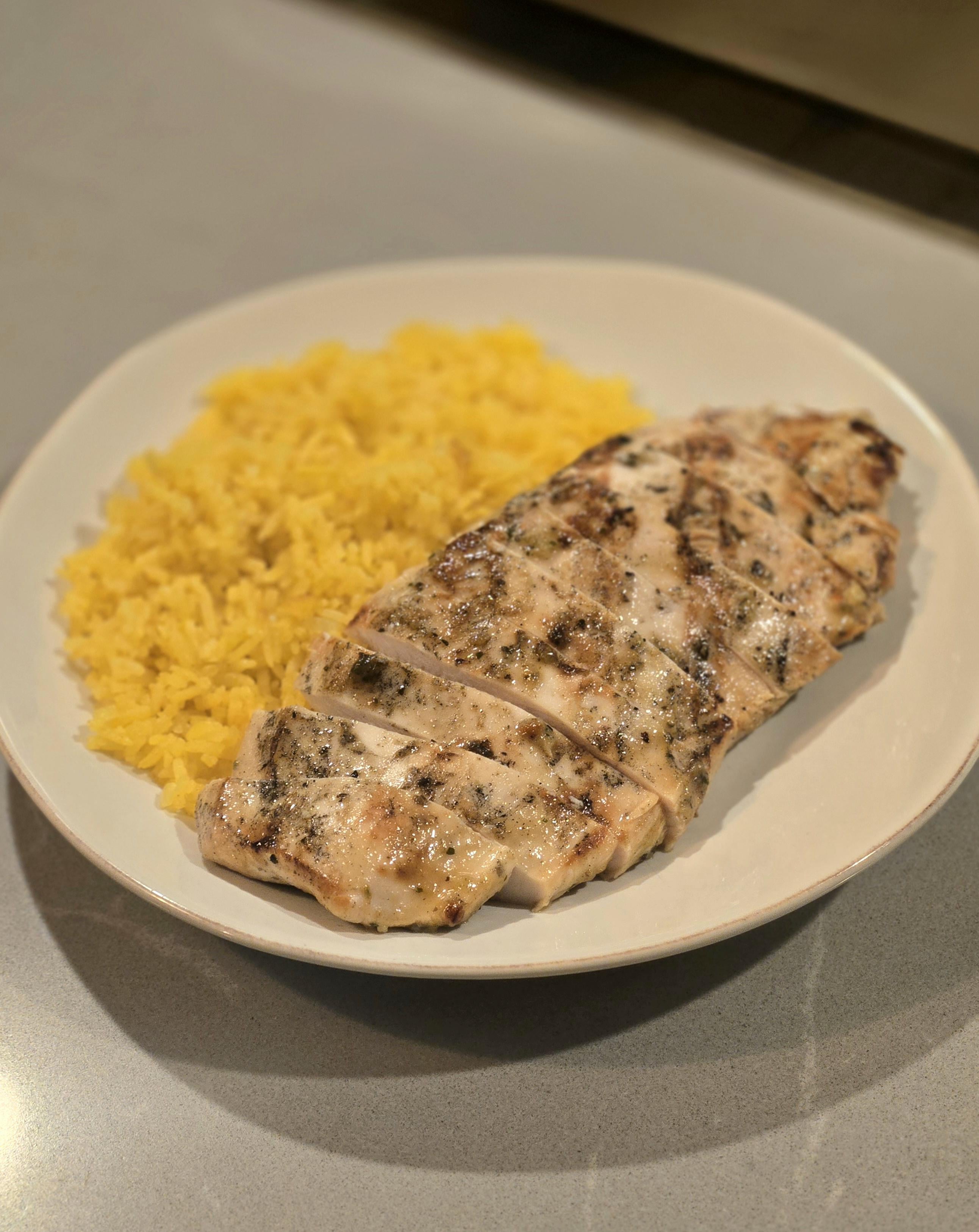 Simple chicken breast with turmeric basmati rice.