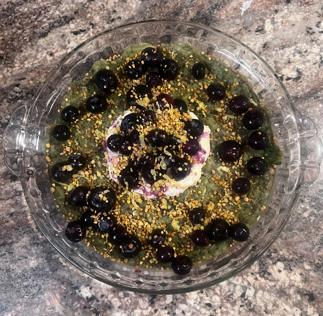 Matcha lemon blueberry baked oats With a Greek yogurt “cheesecake” topping , blueberries , and bee pollen. oats baked with one matcha latte packet , milk, water, chia seeds, sf maple syrup, and cauliflower rice.