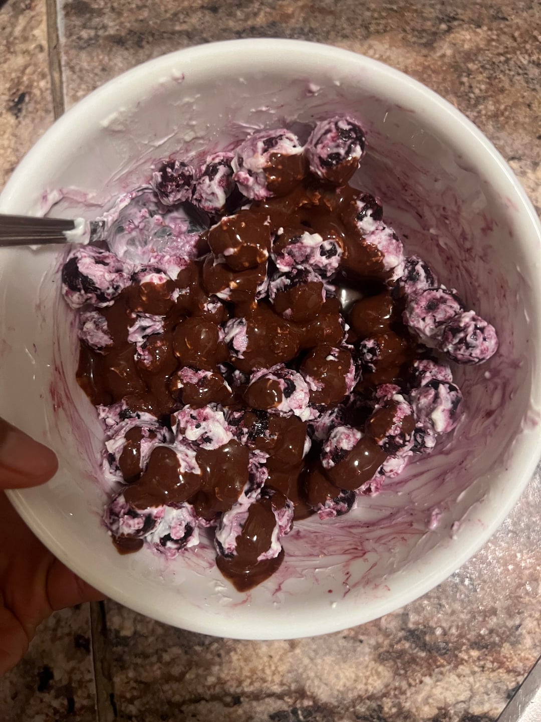 Frozen blueberries toss in Greek yogurt & topped with sf chocolate sauce