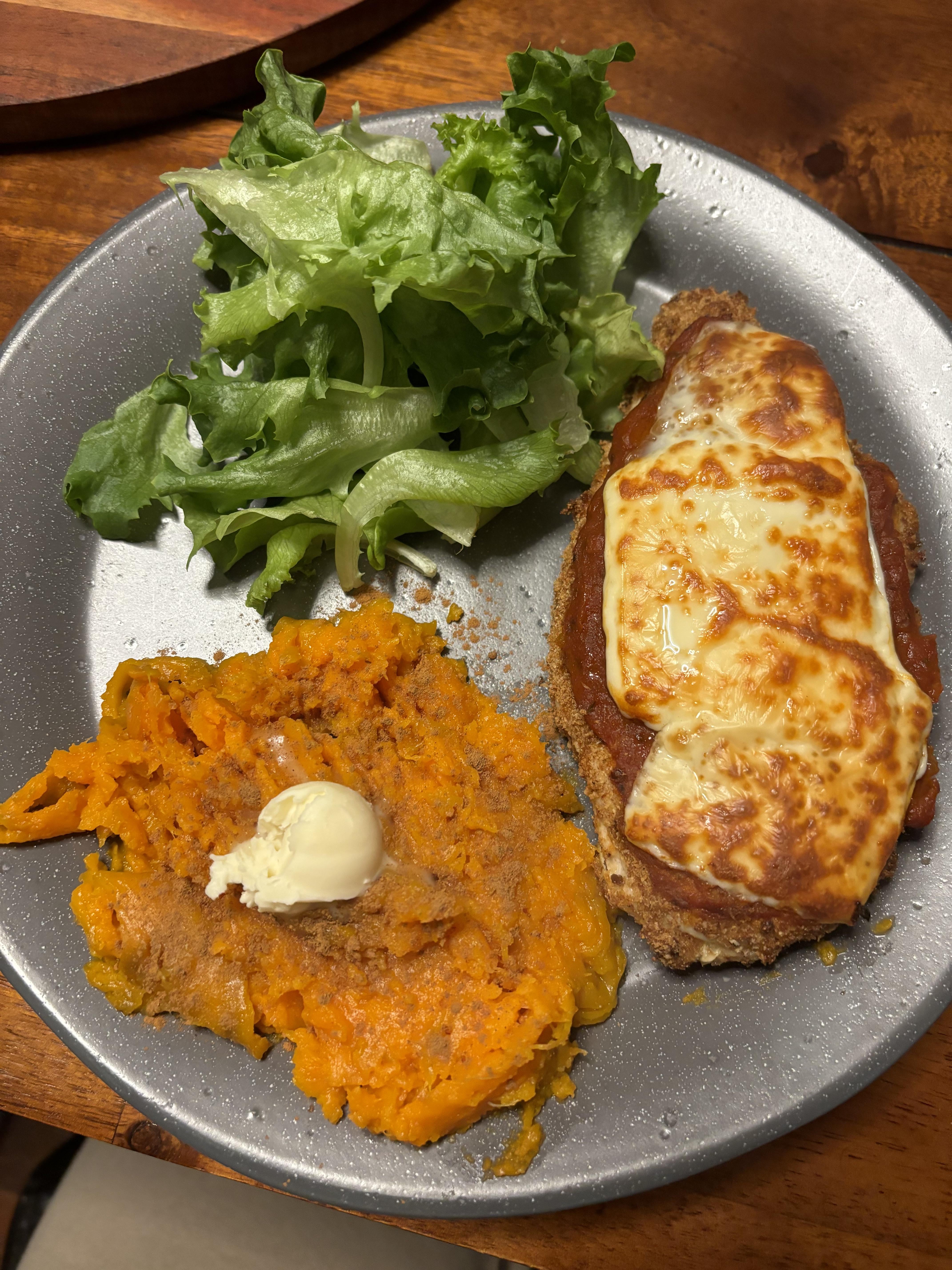Chicken Parm, roasted yam, “salad” & honey lemon dressing. by Non-Linearsequential Dinner Tonight Tonight's Dinner