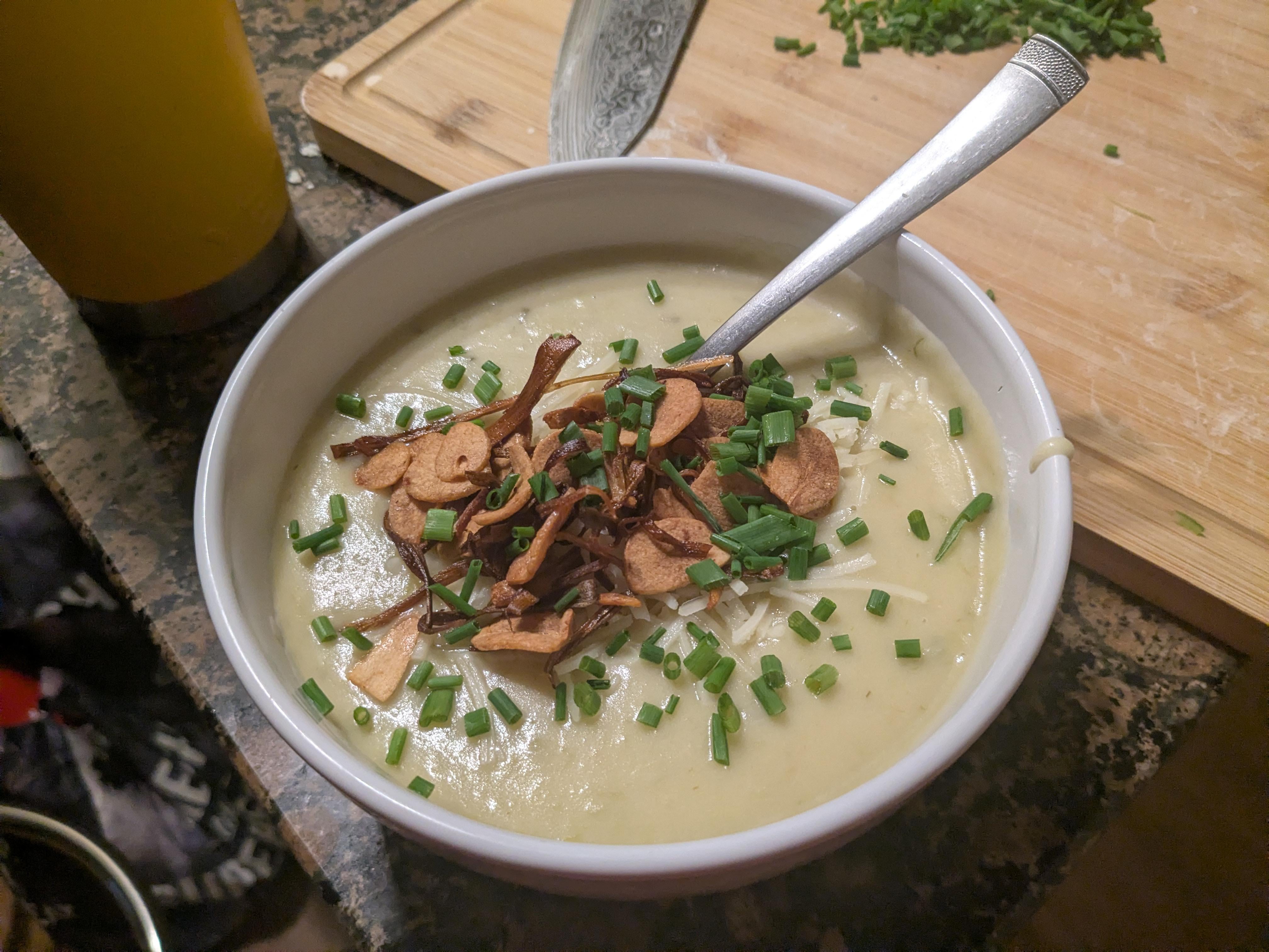 Potato leek soup but with enough roasted garlic to kill an army of vampires shoved in there as well as fried garlic on top and crispy leeks by Salty-Sock-3886 Food