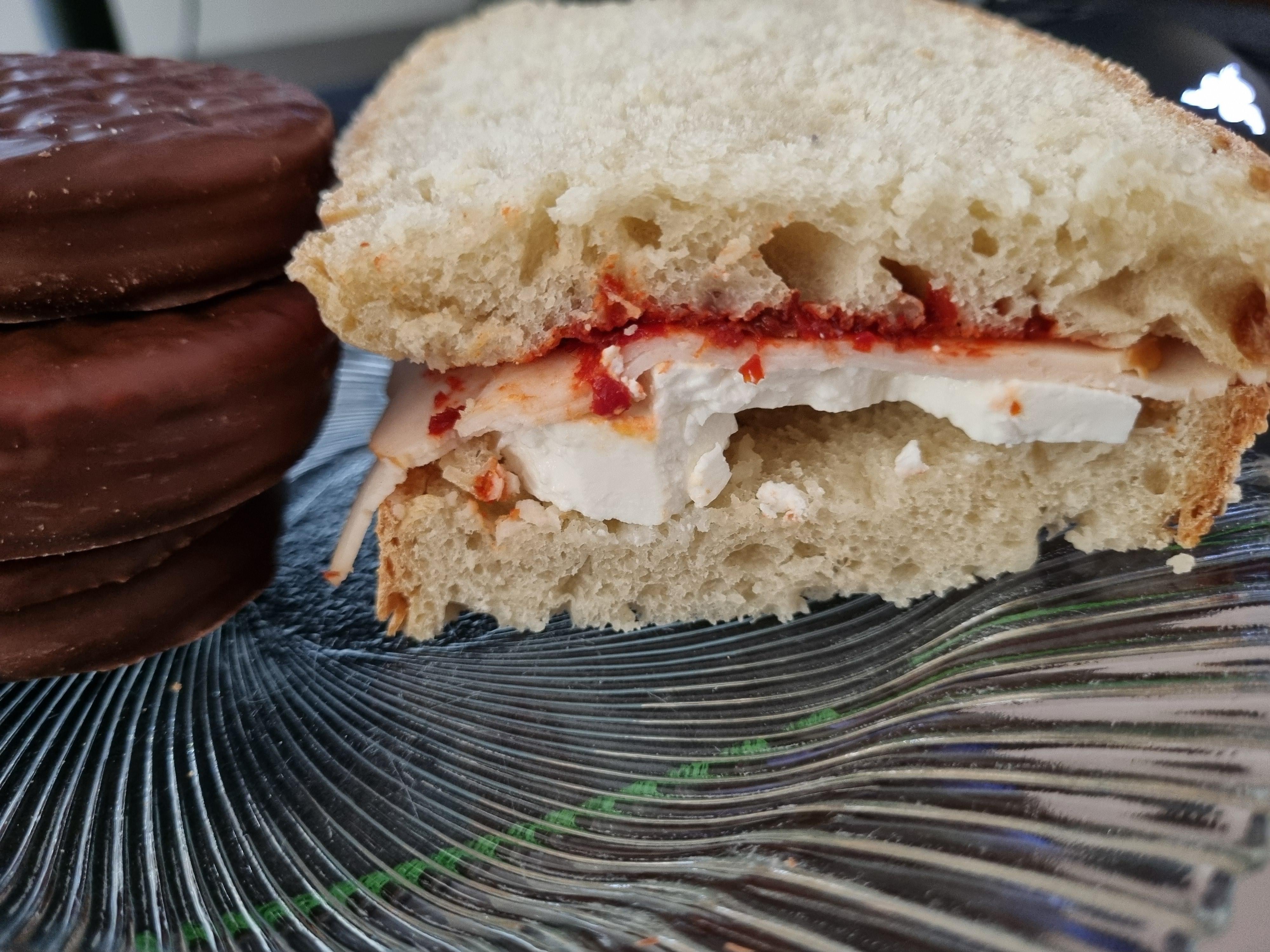 Real bread+white cheese+turkey+tomato/paprika paste