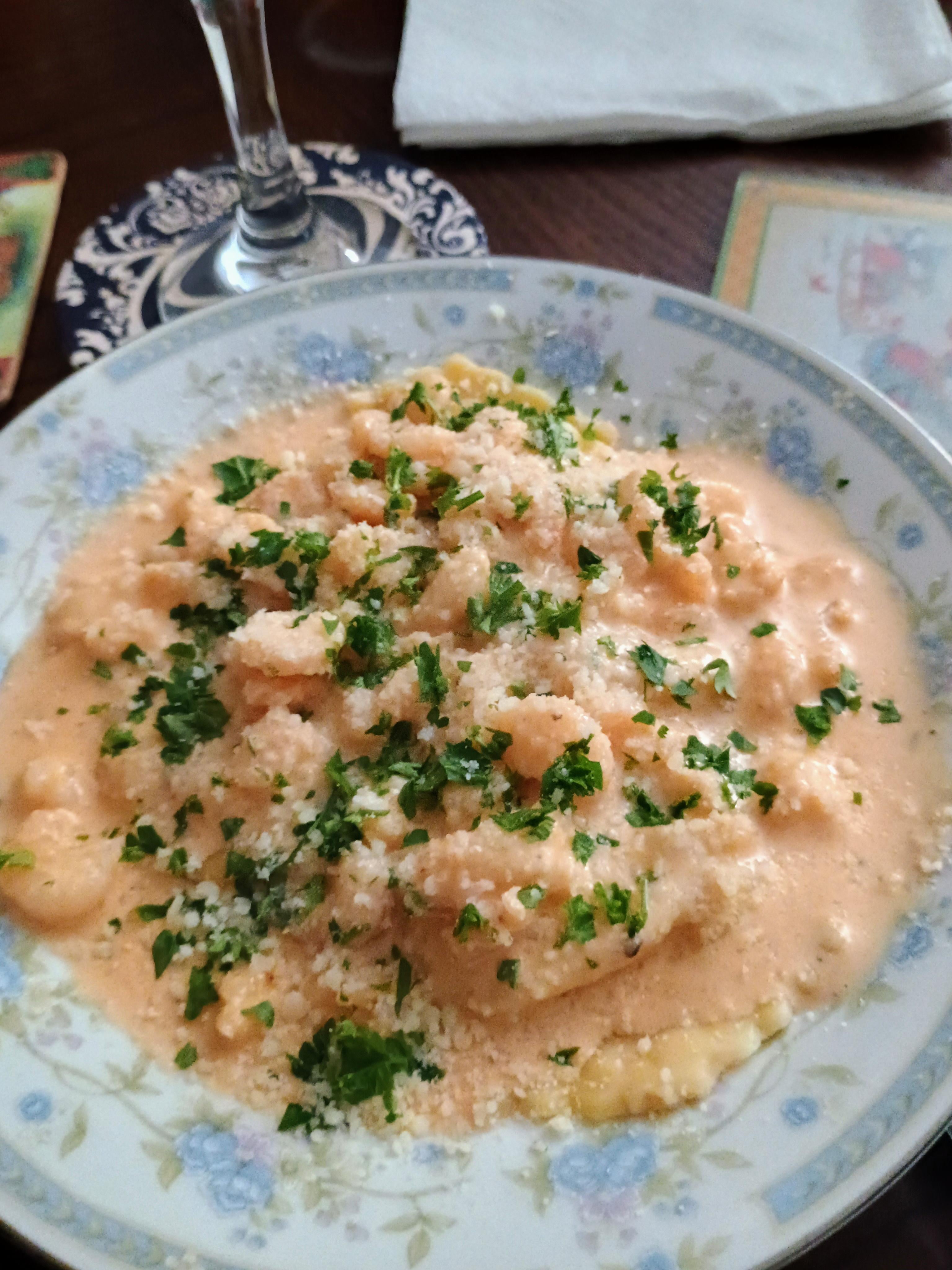 My SO made this delicious lobster ravioli in a lobster sherry (sp?) cream sauce with these baby shrimps in them. Paired it with a ces salad, garlic bread of course and white wine.