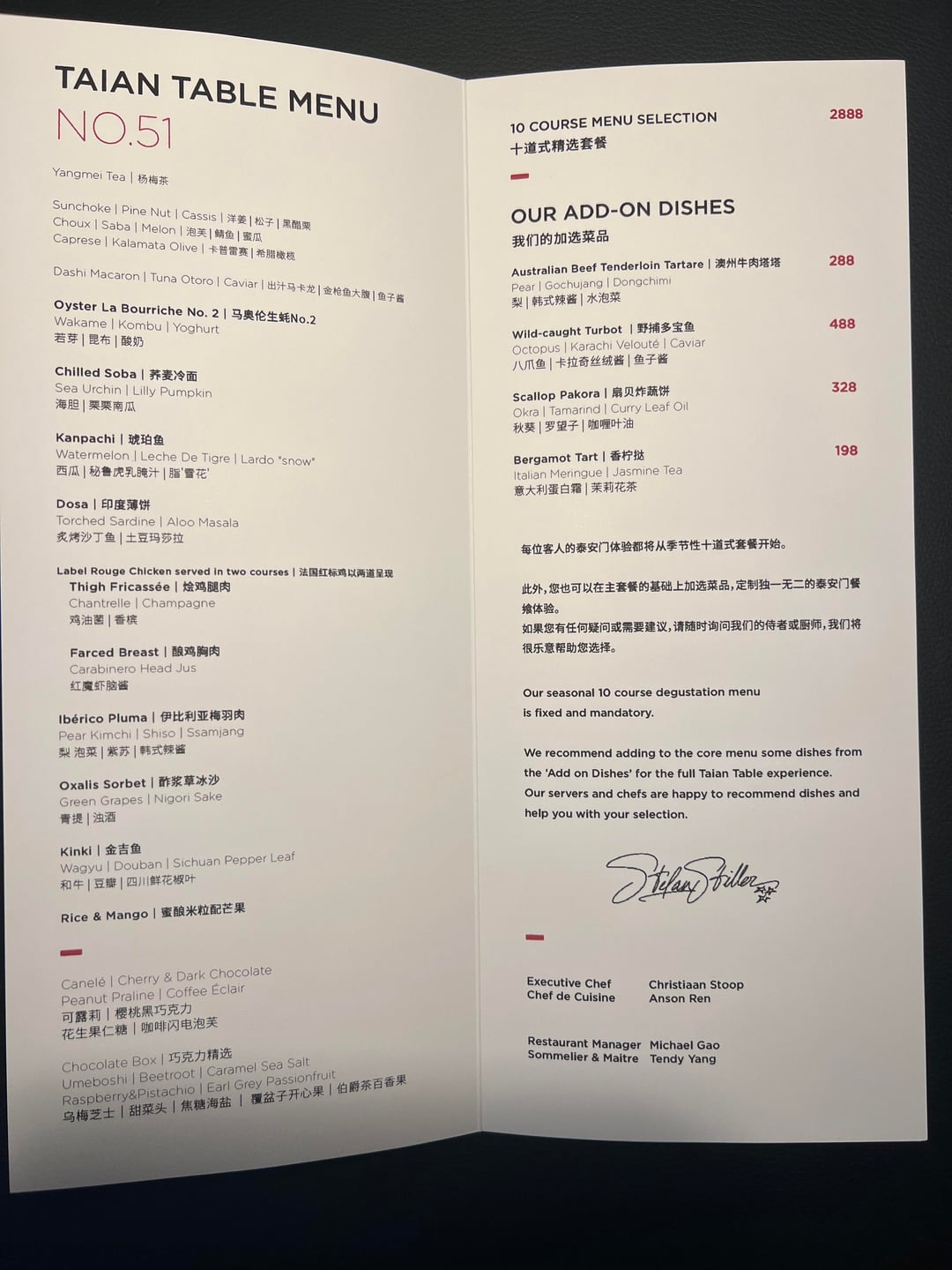 Taian Table (8-12) was another highlight. I’m personally a big fan of chef’s table concepts, so this was an easy choice. The food was outstanding and we ended up talking with the head chef and sous chef for about 40 minutes, which made the experience even more memorable.