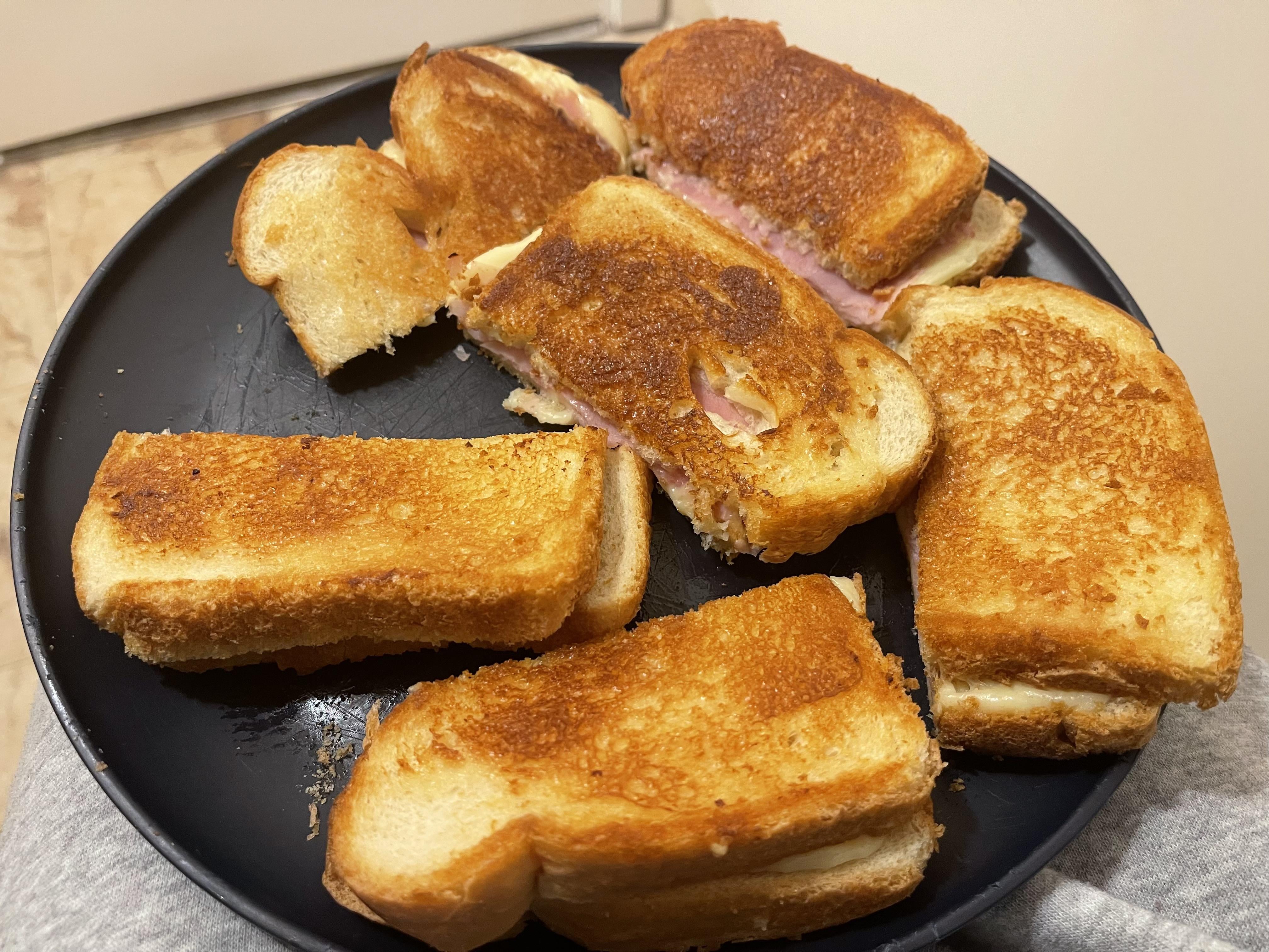 Grilled cheese with ham. Food insecurity and depression hitting hard during my first vacation week and my sibling doesn’t care.