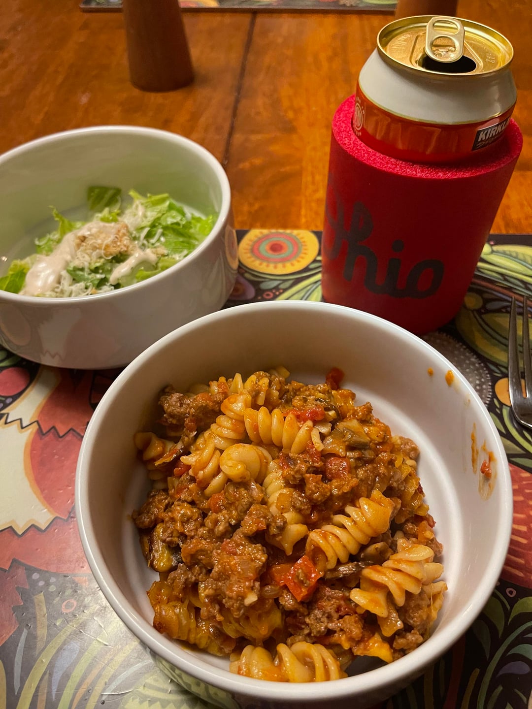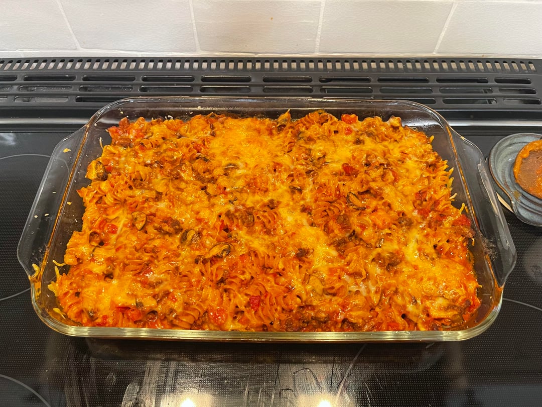 Johnny Marzetti is a Midwestern baked pasta casserole with ground beef, onion, bell pepper, garlic, mushrooms and tomatoes. Macaroni is traditional but I had a rotini in the pantry. Mix in cheddar and Parmesan and bake at 350 for 30-45 minutes. Usually it’s topped with a lot more cheese but we reduced the amount suit my wife’s taste. Served with a Caesar salad and paired with your favorite lager. Accompanied by Charlie Crockett “A Dollar a Day”