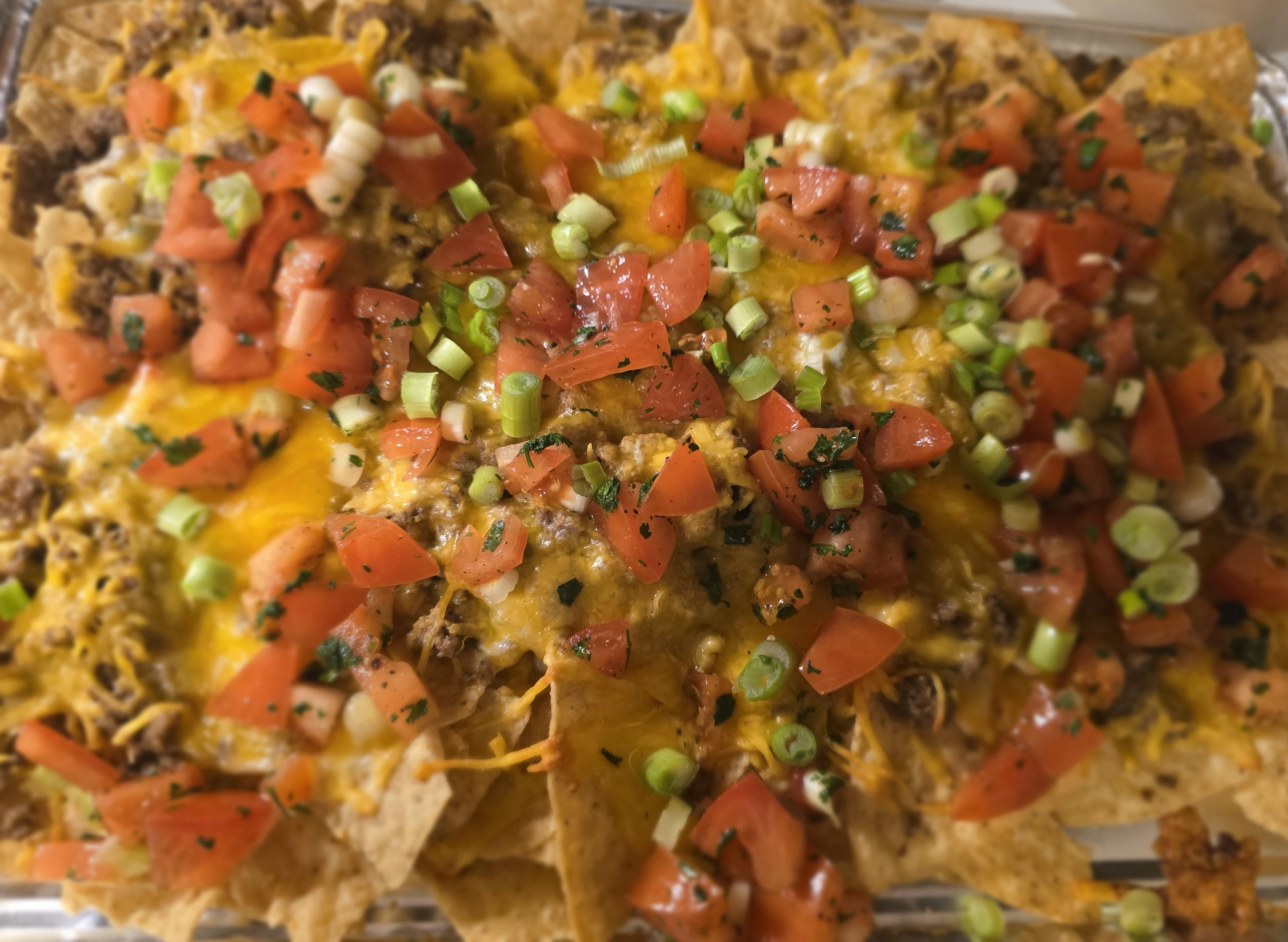 Chips, microwaveable queso mixed with blended cottage cheese, ground turkey with taco seasoning, chunky homemade pico de gallo & shredded cheddar cheese. Guacamole and sour cream served on the side.