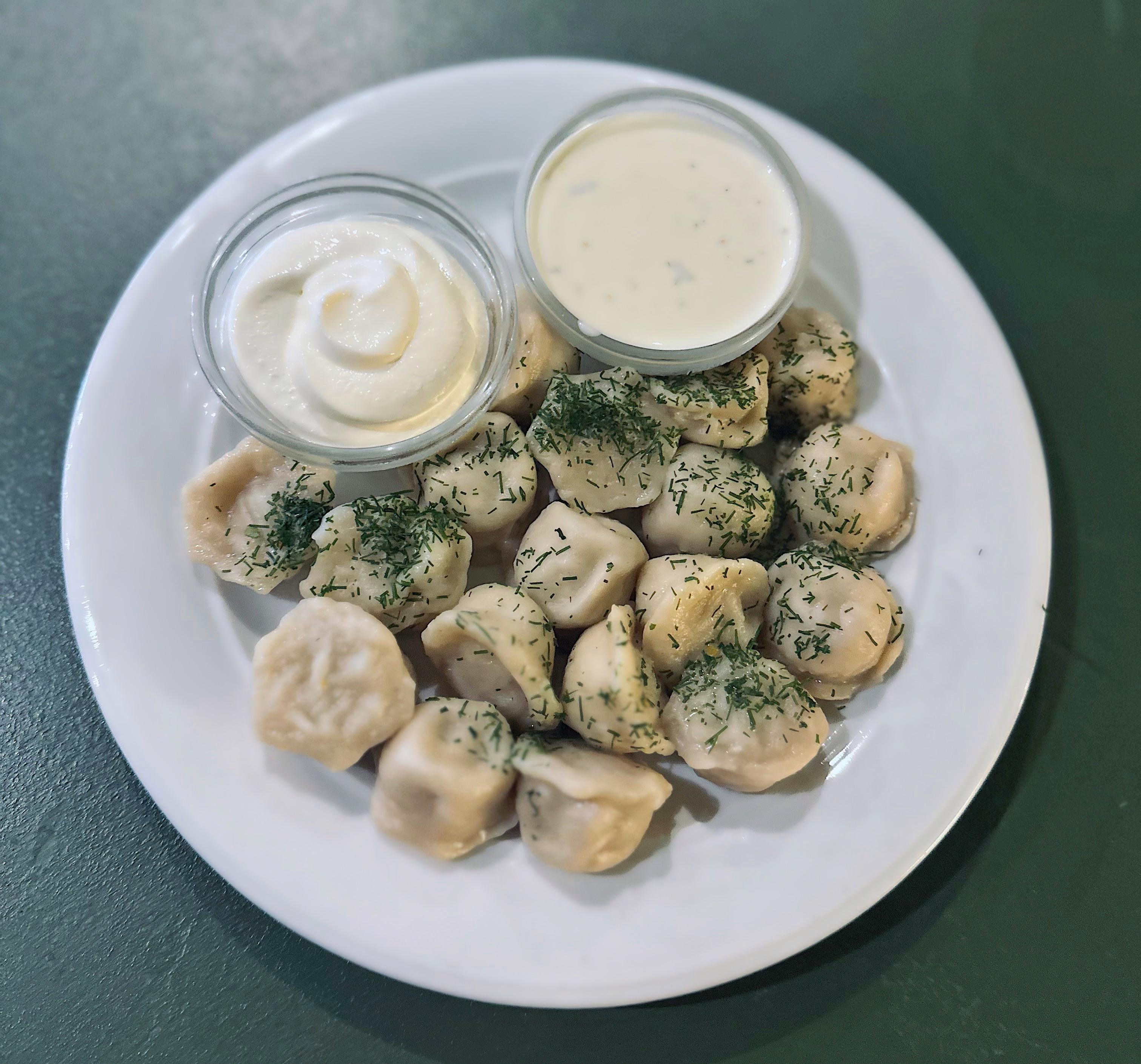 [I ate] Boiled pelmeni with sour cream and warm flour sauce