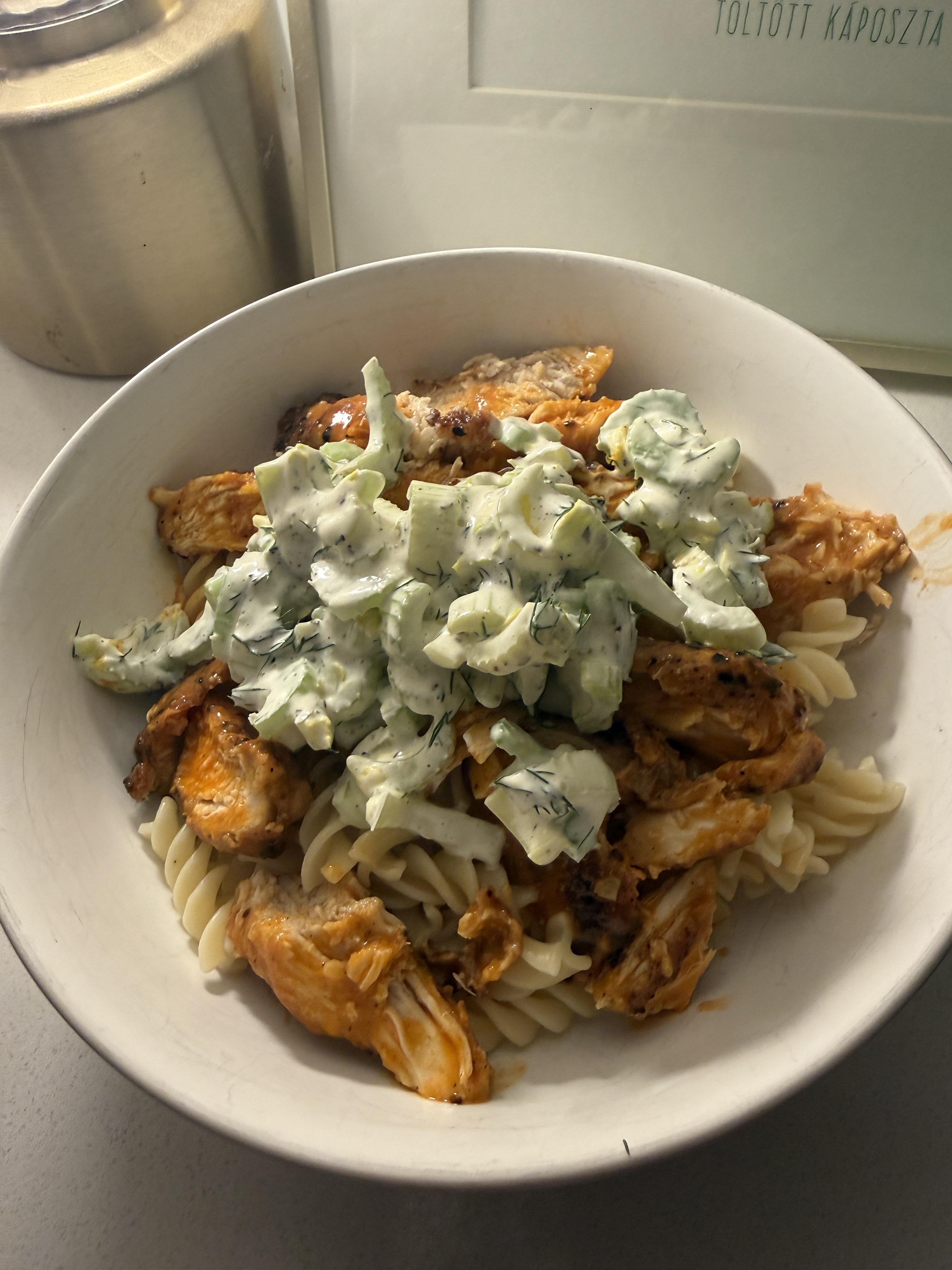 – Sliced up once cooked and mixed in with buffalo sauce of my choice (I used Melinda’s Ghost Pepper wing sauce)