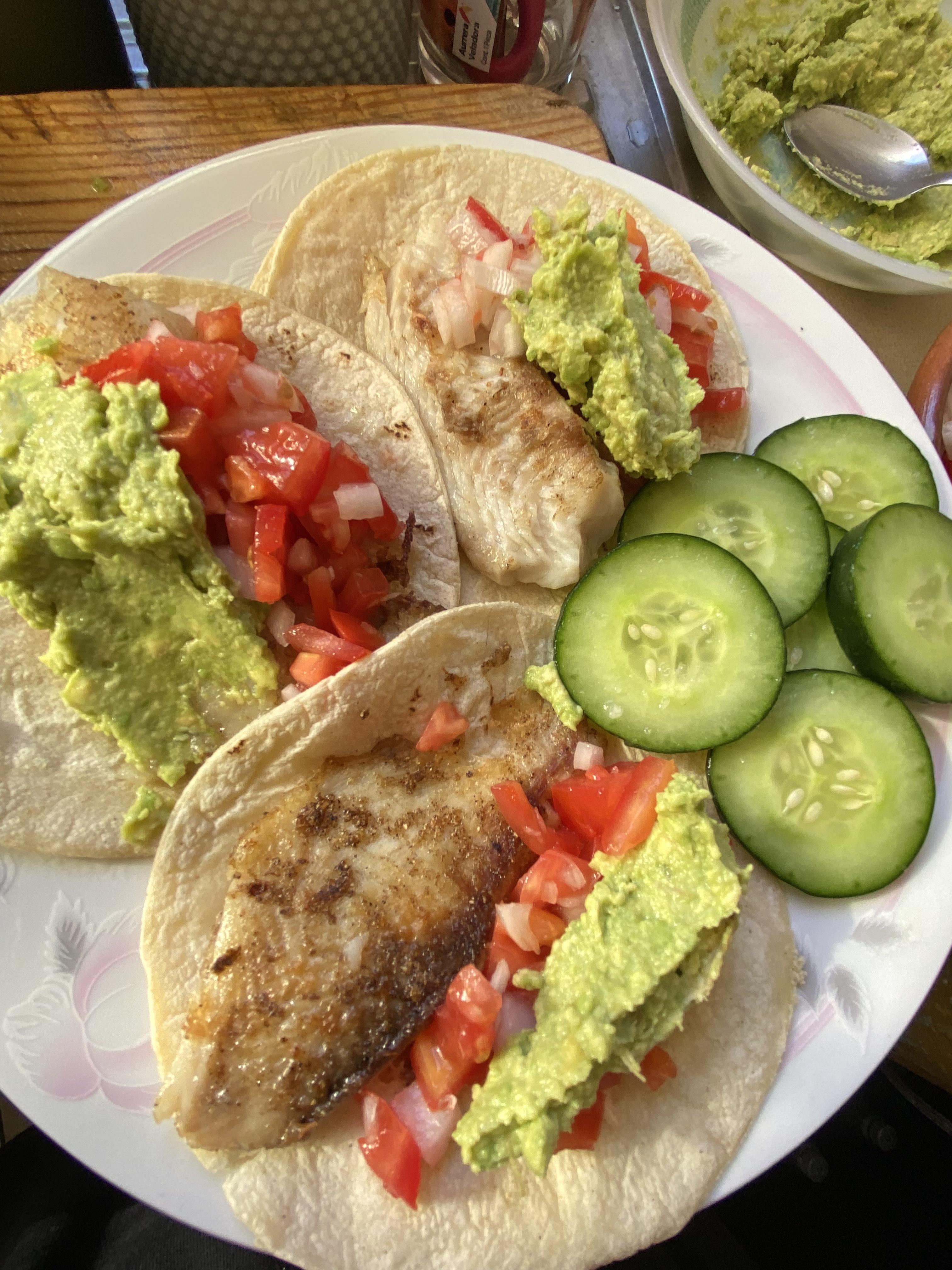 Grilled fish tacos with avocado, tomato, and sliced cucumber