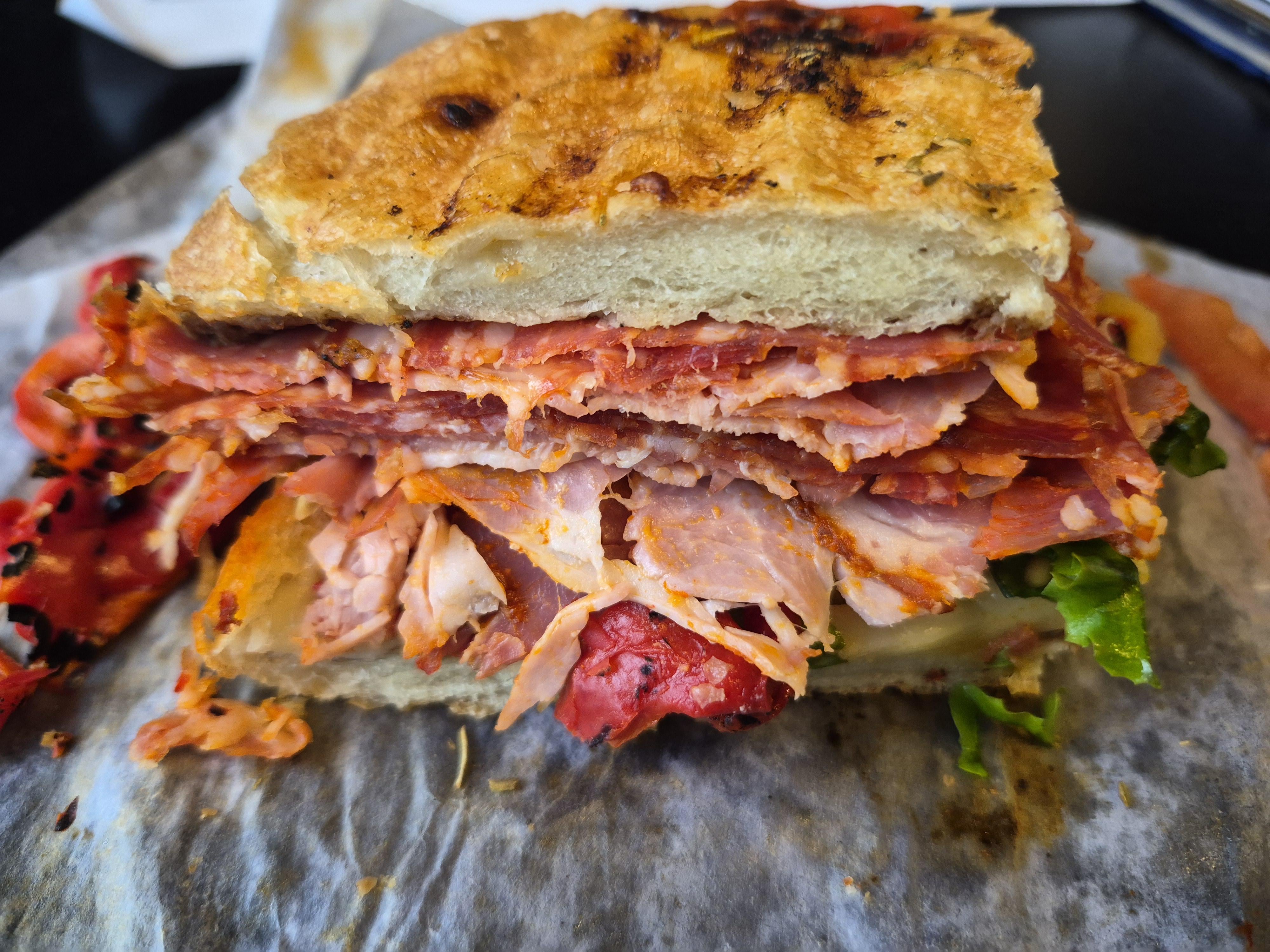 Hot capicola, mortadella, salami, mozzarella, hot banana peppers, pickled eggplant, charred peppers, and spinach on focaccia bread, grilled. by sandiercy Food Porn