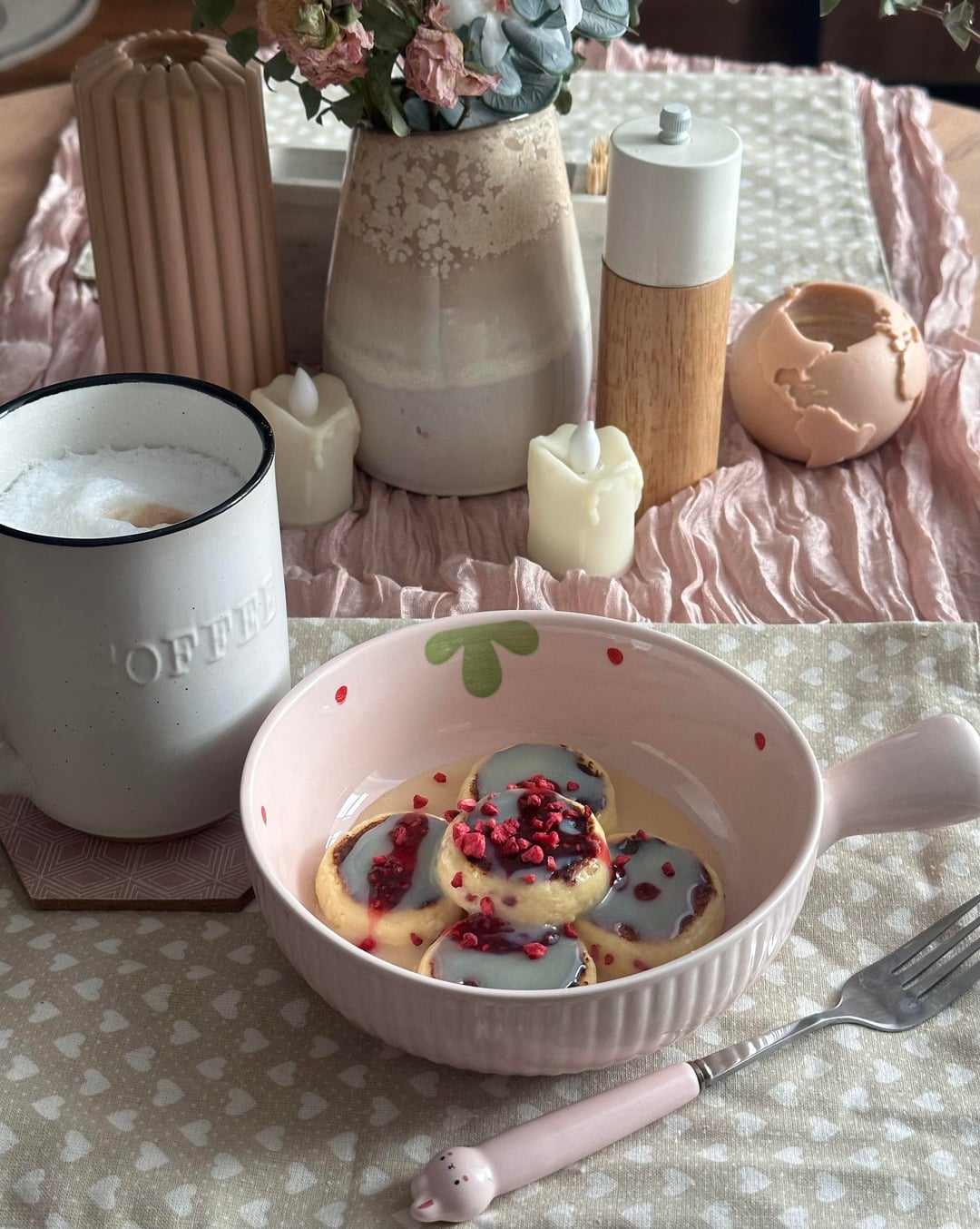 Breakfast: raspberry syrniki, condensed milk topping and raspberry jam, cappuccino (259 cals, 28.85g protein)