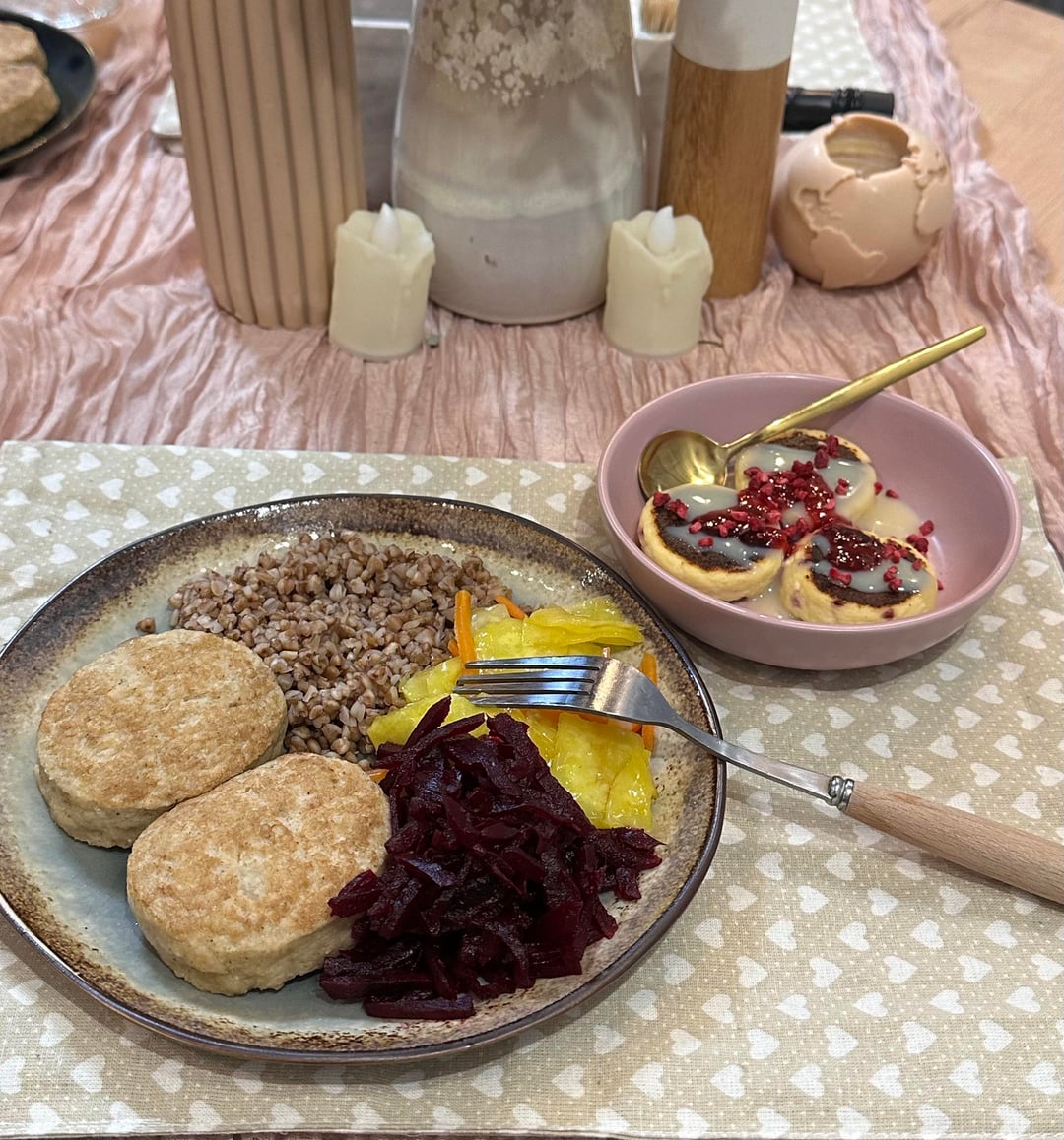 Lunch: buckwheat, chicken cutlets, saffron fermented cabbage, beets (291 cals, 26g protein) and leftover syrniki with condensed milk and raspberry jam for dessert (101 cals, 13.9g protein)