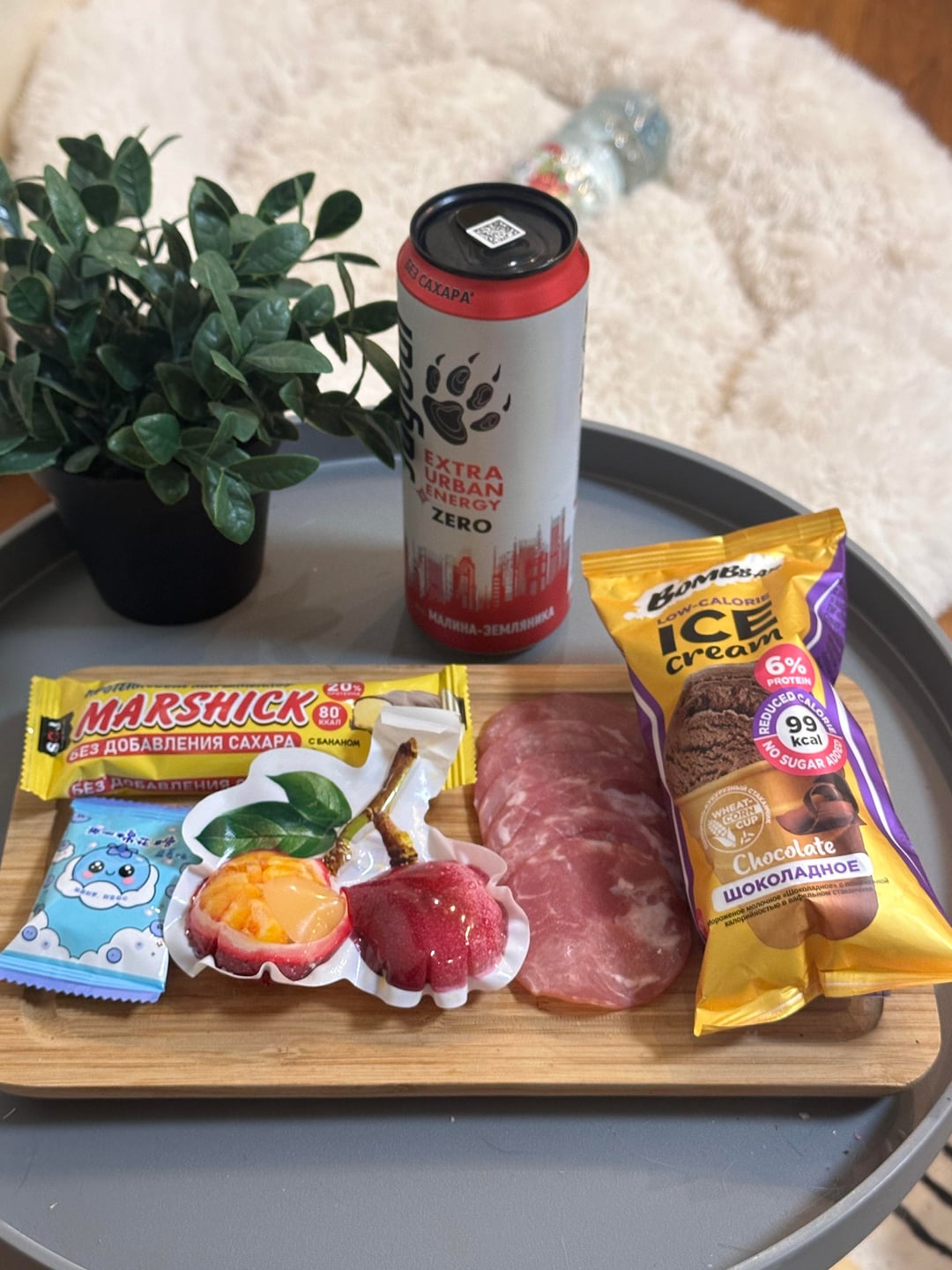 Snack: protein bar, dry smoked meat, marshmallow, konjac jelly, ice cream, zero sugar energy drink (243 cals, 20.1g protein)