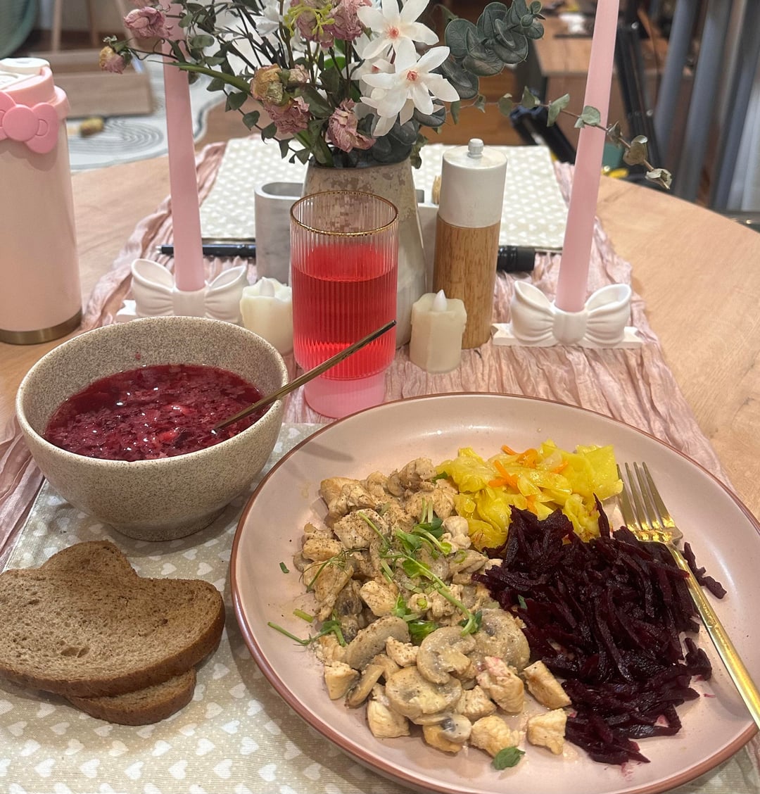 Dinner: borscht and 1 slice of rye bread (100 cals, 5.88g protein), chicken breast with mushrooms in sour cream sauce, fermented cabbage and beets (298 cals, 39.5g protein), raspberry flavoured water