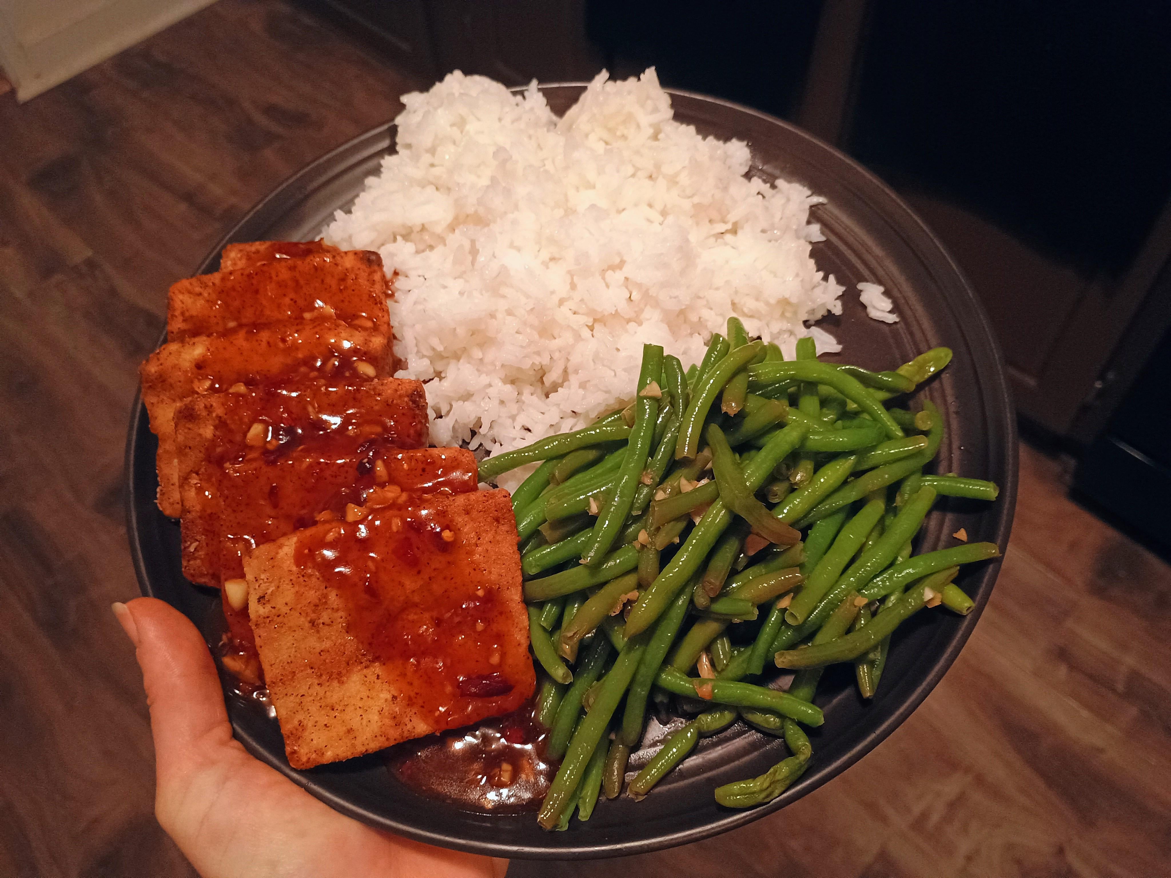 Super crispy fried tofu with a sweet and spicy chili sauce, green beans with garlic and ginger, and white rice