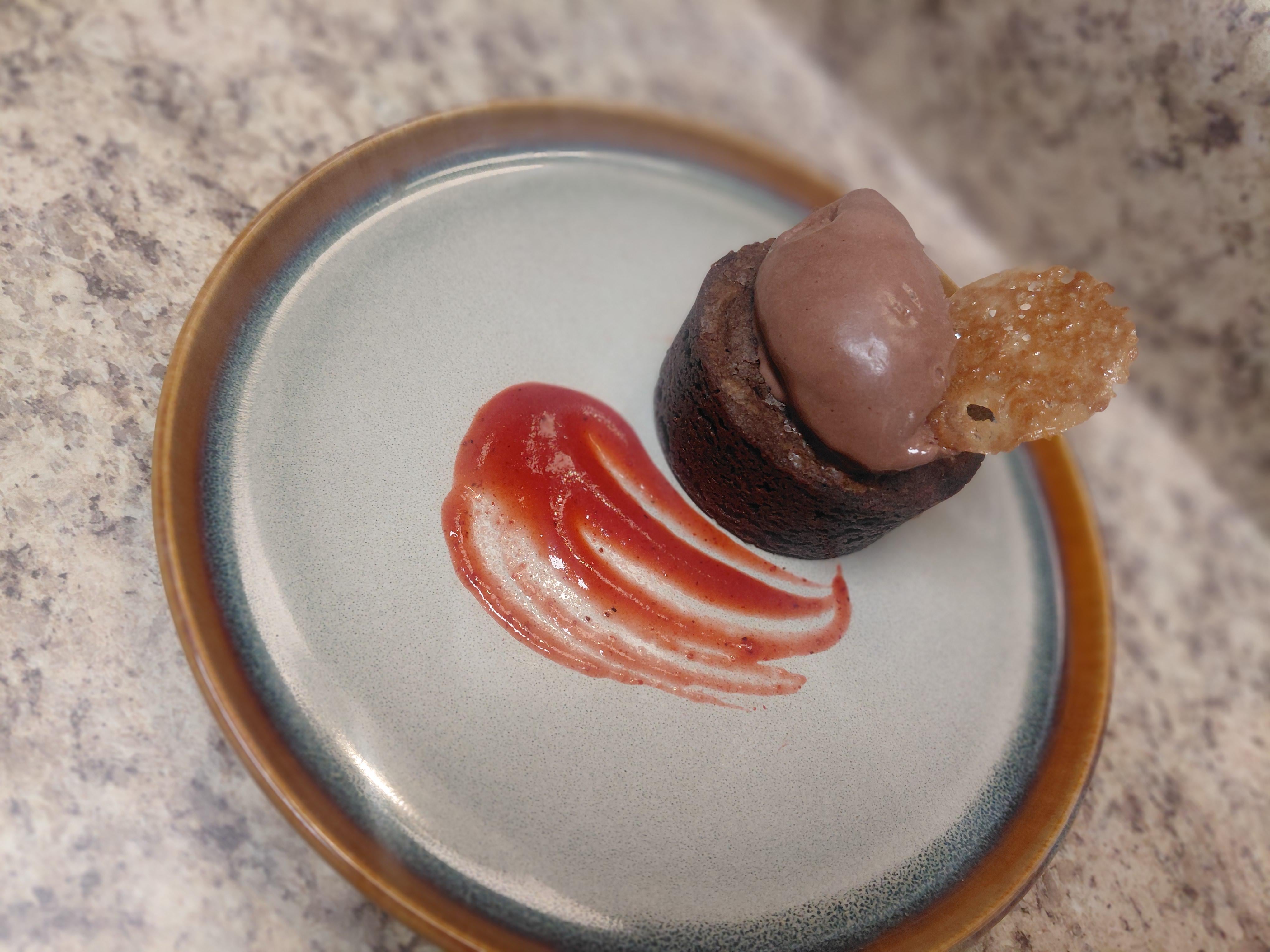 Traditional brownie with a Applewood smoked Chocolate ice cream, sweet Tuile, and a Strawberry Tajin cooli. by Mountain_Low_5449 Food Porn