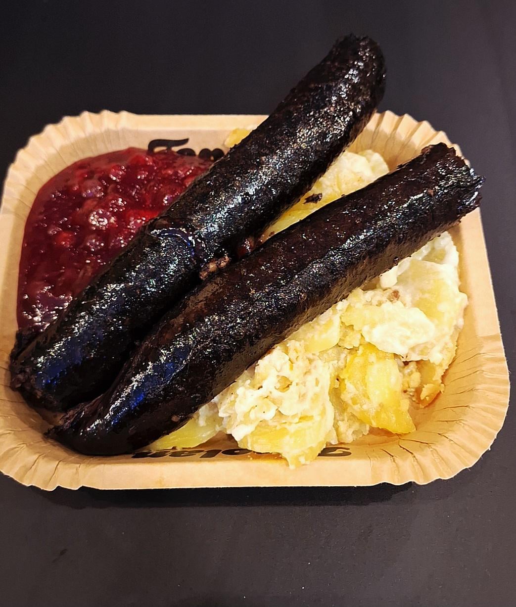 [I ate] mustamakkara, blood sausage. With blue cheese creamed potatoes and lingonberry jam by Korpikauhu Food