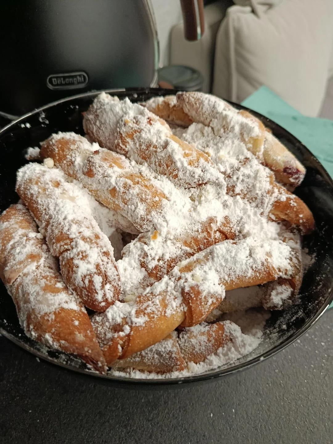 Here are the recipe: 1) 400ml of water 2) 400ml sunflower oil 3) teaspoon of salt 4) tablespoon of sugar 5) 11g dry yeast 6) 800-1000g of flour 7) filling of your choose, for example: berries, apples, jam etc.