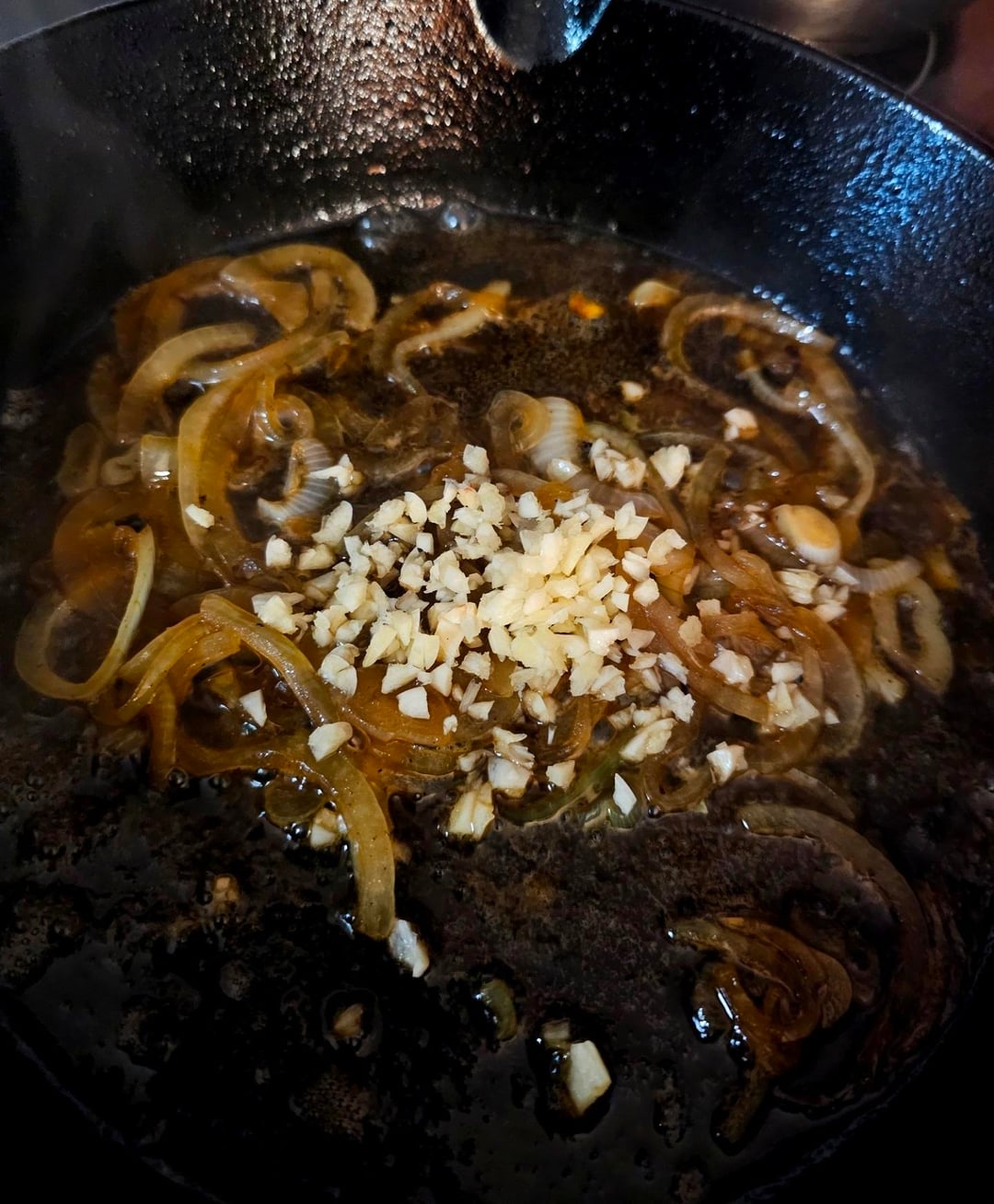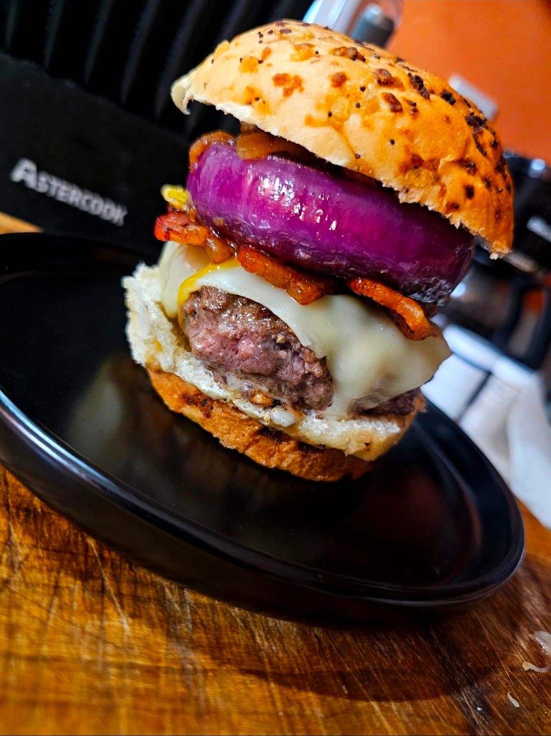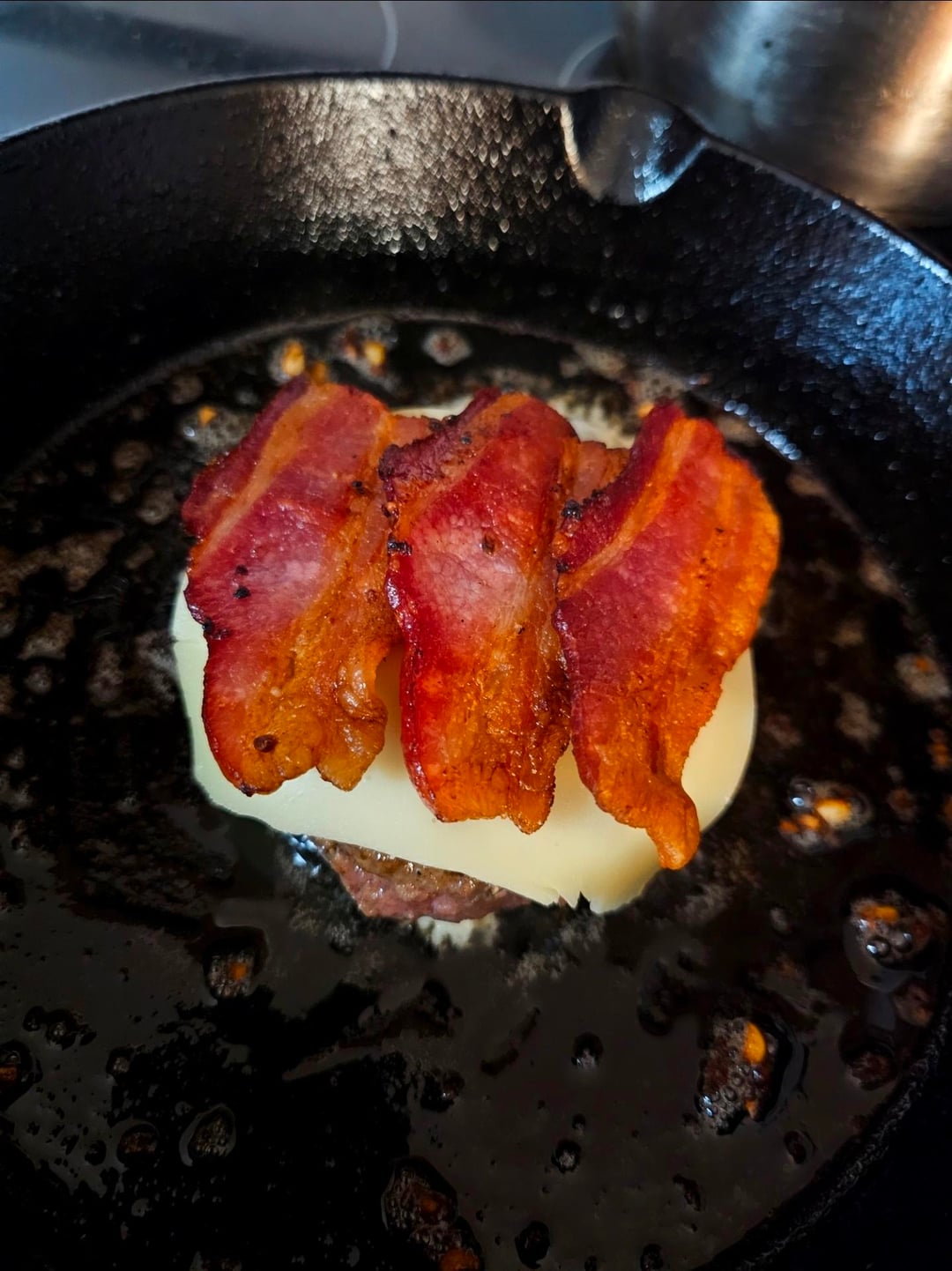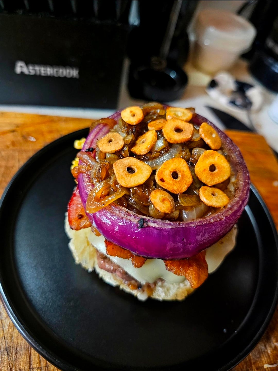 Toss the burger around in what's left of the whiskey glaze in the pan, add cheese, bacon, the egg/onion filled ring, & top w/ fried garlic. Give it a squish or unhinge your jaw and enjoy! 🤣