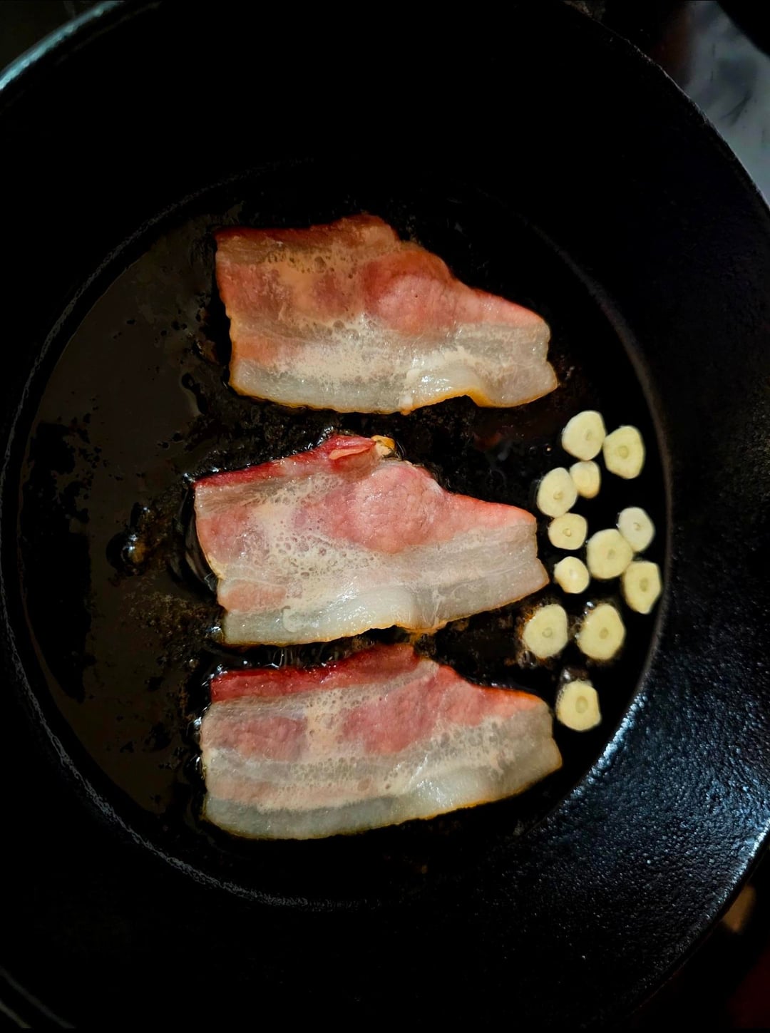 Crisp up some bacon and garlic then cook the burger in the garlicky bacon fat, then use an onion to make a ring to hold an egg and fry that in the beef fat.