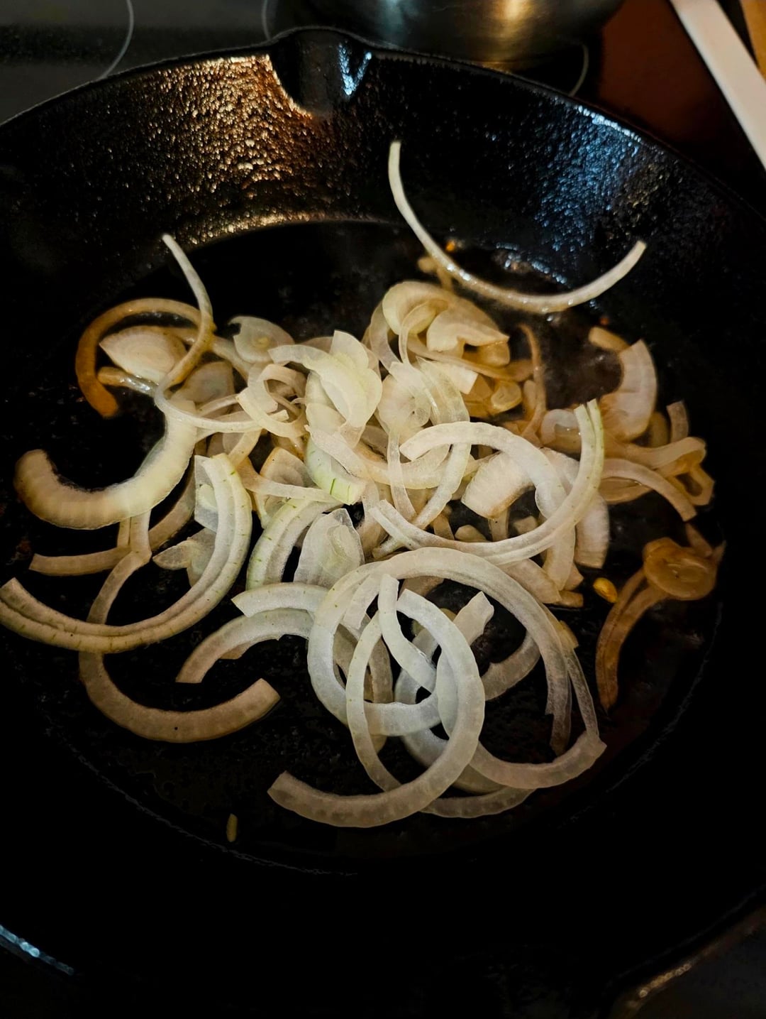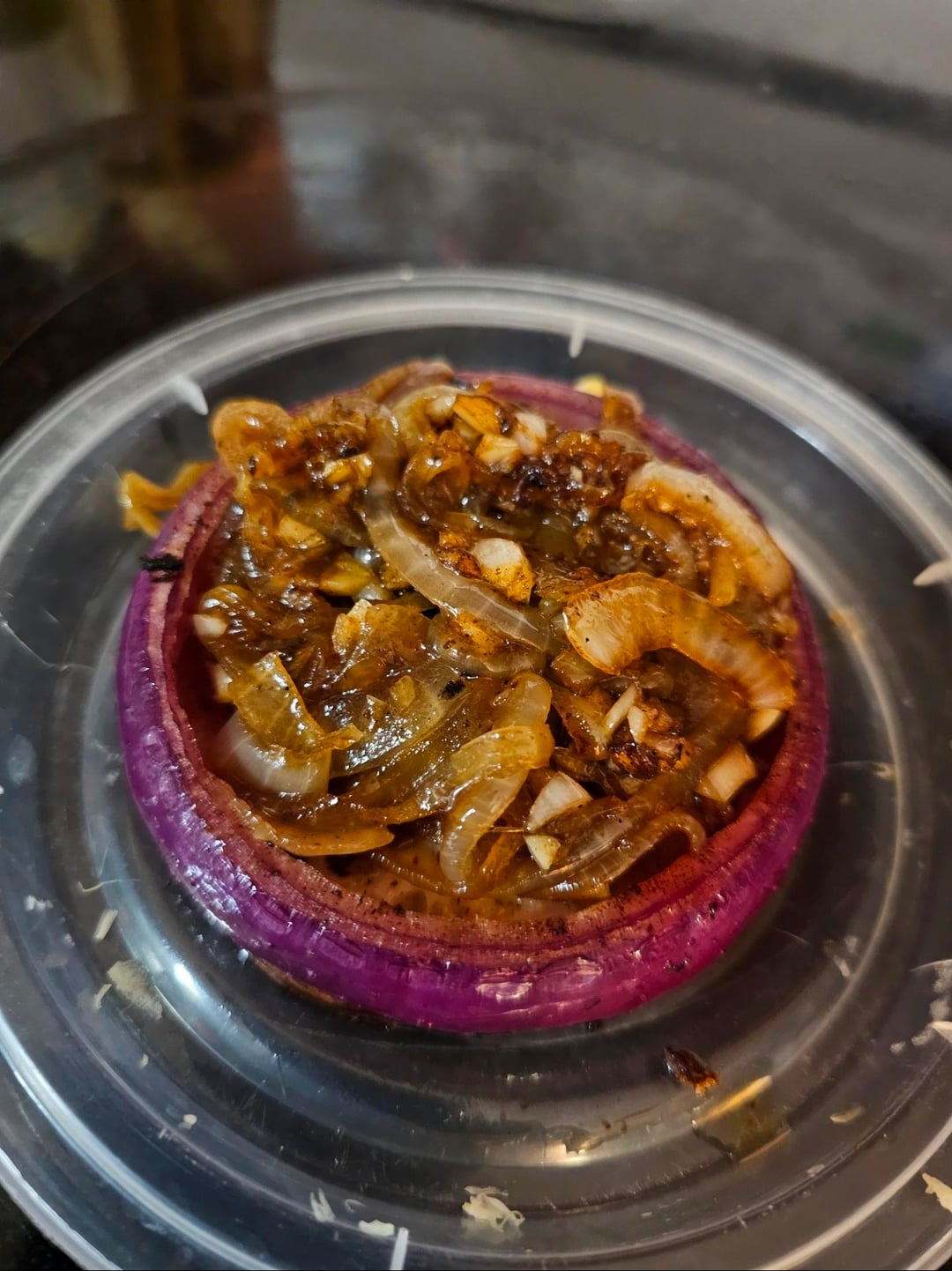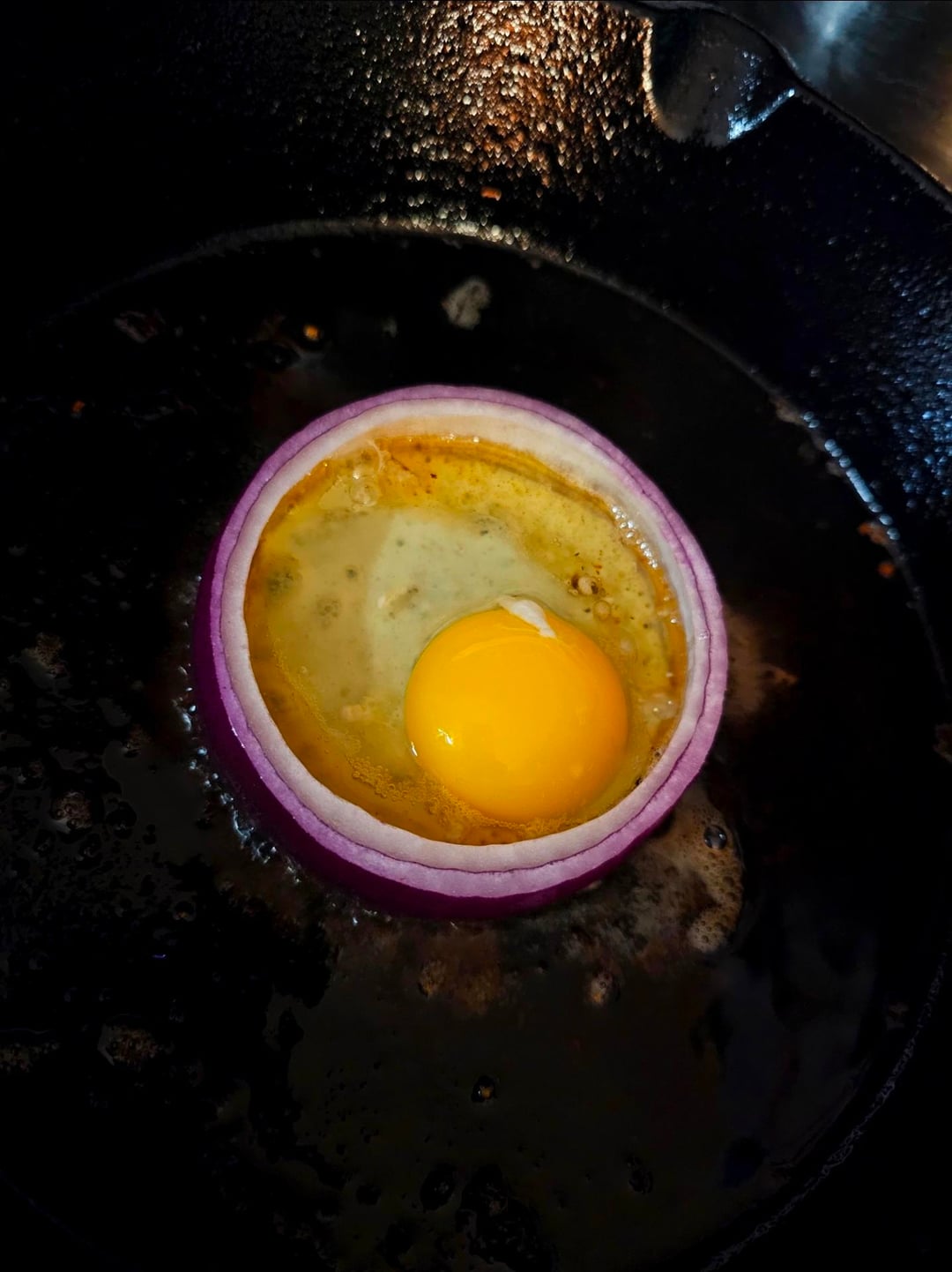 Cook some onions until they start to turn color then deglaze w/ honey whiskey, add garlic, simmer until fragrant, and fill the rest of the onion/egg ring with the whiskey onions.