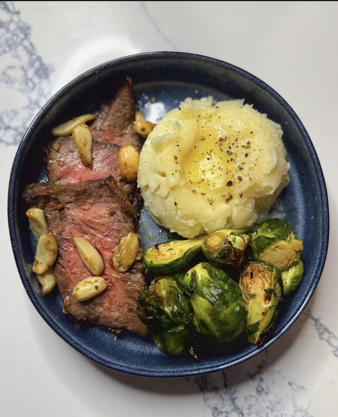 Sliced Sirloin, Roasted Garlic, Mashed Potstoes & Maple Bacon Brussel Sprouts by sweetandsaltyyyyy Food Porn
