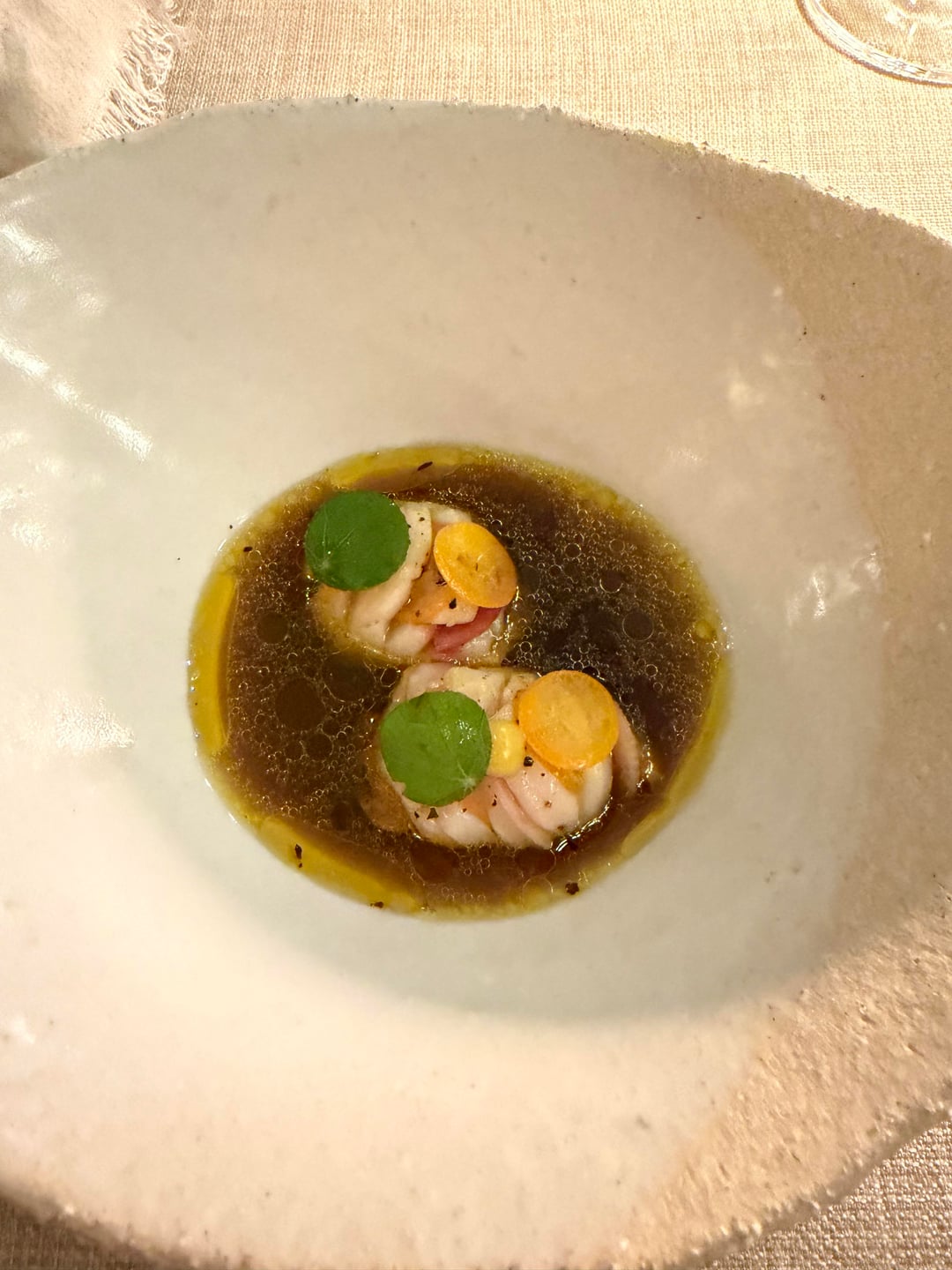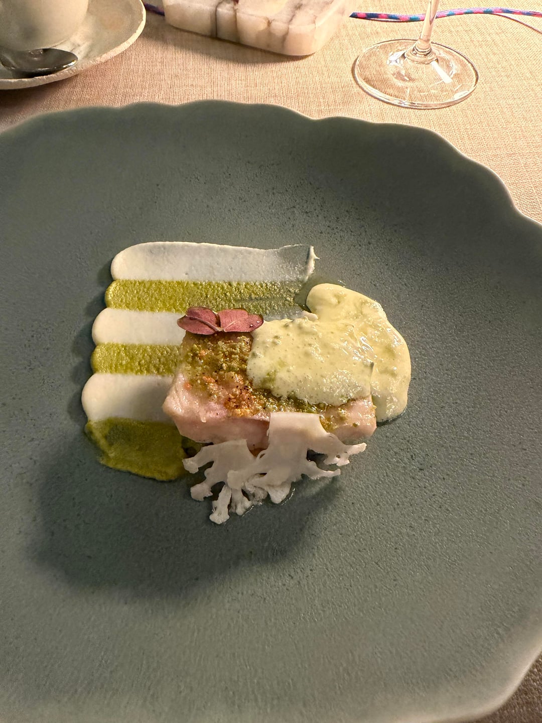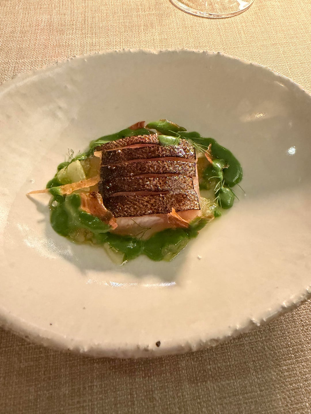 The amouse bouches were great, though nothing to write home about. The wine list was also extensive and we went with a bottle instead of the pairing. The first two courses were the snail croquette (good). And the trout (amazing). The sauces were served alongside, with extra in little boats which I truly appreciated.